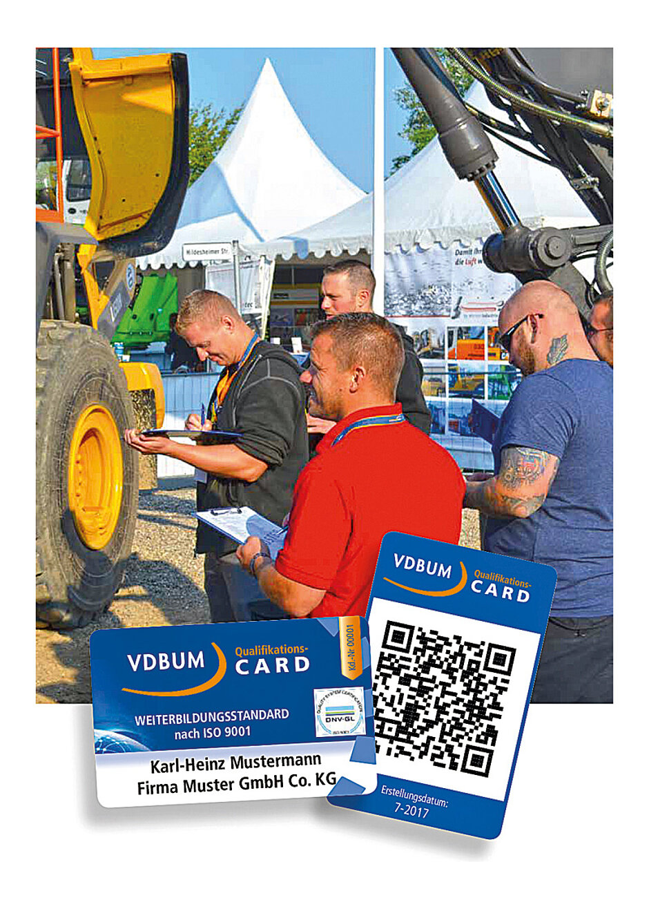 Die Schulung seiner Mitglieder und Mitgliedsunternehmen zählt seit jeher zu den Hauptsäulen des Verbandes der Baubranche, Umwelt- und Maschinentechnik (VDBUM). Jährlich absolvieren rund 2 500 Teilnehmer die Qualifizierungsangebote der VDBUM-Akademie. Ein Novum im neuen Programmjahr: Alle Akademieteilnehmer erhalten eine VDBUM-QualifikationsCard. Die Karte bietet dem Mitarbeiter die Sicherheit, sich überall mit seinen Qualifikationen ausweisen zu können. Sie dokumentiert die Befähigung zur Sachkundigenprüfung für unterschiedliche Geräte und Maschinen, die einer jährlichen Sicherheitsprüfung unterliegen.