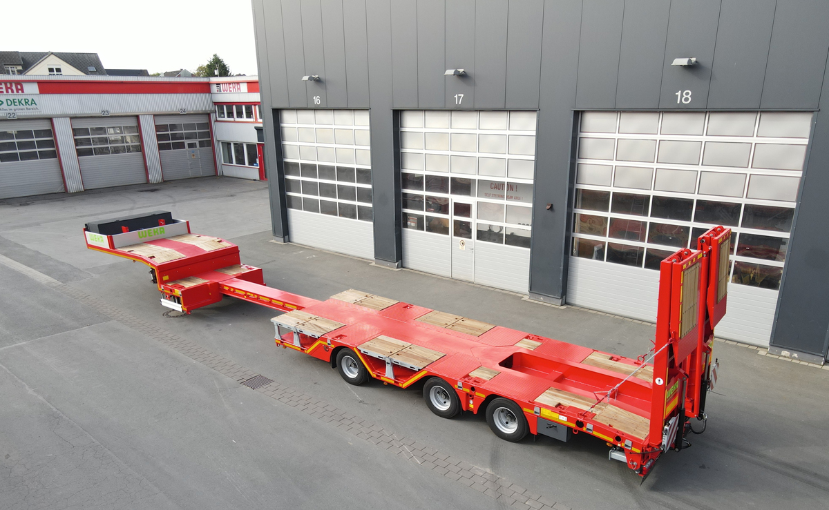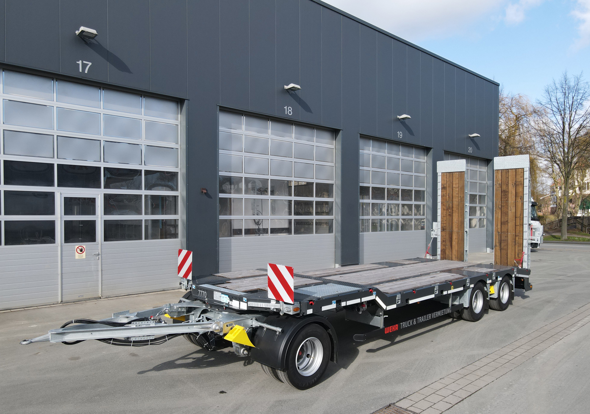 Ab einen Tag zu mieten: Dreiachs-Tieflader von WEKA Rental, auch in teleskopierbarer Ausführung