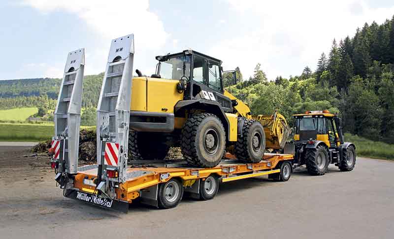 Die Auffahrrampen werden kräfteschonend hydraulisch abgeklappt. Die mit glitschiger Deponieerde beschichteten Reifen finden dabei sicheren Grip auf den mit Gitterrosten ausgefachten Auffahrrampen. Die niedrige Ladefläche unterstützt eine zügige Beladung und die richtige Transportposition ist schnell erreicht. Für die Ladungssicherung werden bereitliegende Spannketten angelegt, die an den gut zugänglichen Anschlagpunkten mit dem Radlader verbunden werden.