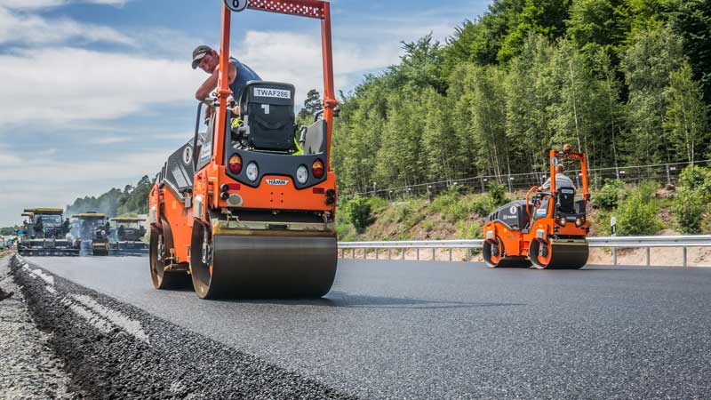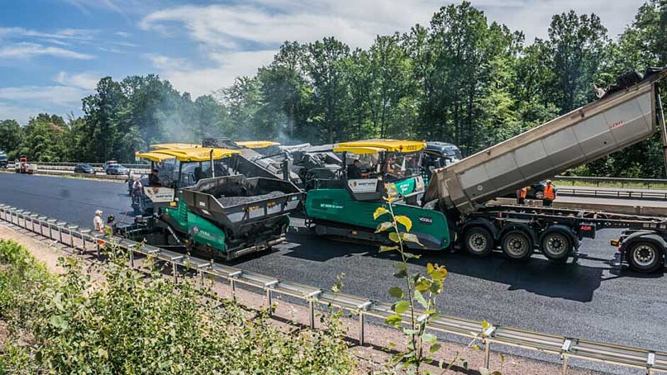 Der Einbau erfolgte heiß an heiß ohne Nähte auf einer Gesamtbreite von 14,50 Metern. Als sehr „personalintensiv" bezeichnet Alexander Wollscheid die gesamte Baumaßnahme, bei der rund 25 Mitarbeiter zum Einsatz kamen. Das lag zum einen an der Vielzahl der verwendeten Maschinentechnik: Neben dem SUPER 1 800-3i sowie einem Vögele MT 3000-2i Offset und fünf Hamm HD 1 0 W von WERWIE nutzte Lehnen zusätzlich zu diversen kleinen Glattmantelwalzen einen MT 3000-2i Standard, einen SUPER 1 800-3i und einen SUPER 21 00-3i. Jeder Fertiger war mit einem Big Multiplex-Ski ausgestattet, die Messergebnisse wurden über die Vögele Nivellierautomatik Niveltronic verarbeitet.