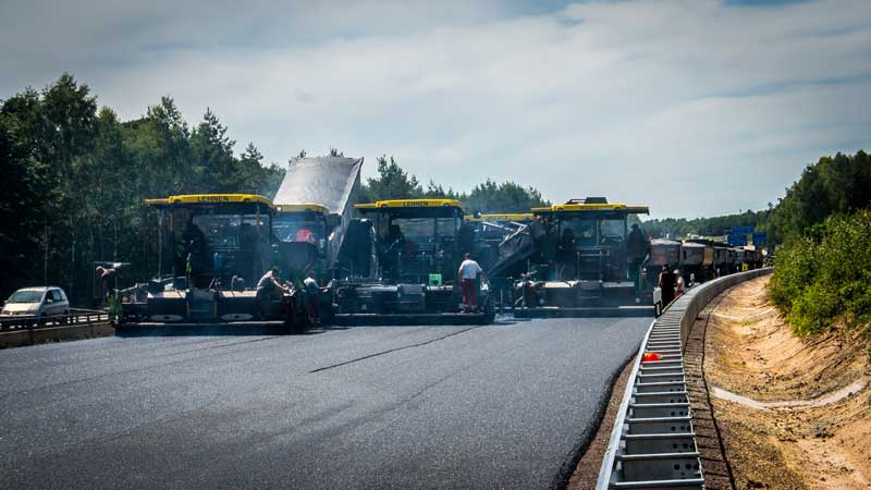 Im Anschluss an die Erdbau- und Fräsarbeiten wurde zunächst eine stabile 22 cm dicke Tragschicht in zwei Lagen aufgebracht. Wurde die erste noch mit Draht nivelliert, nutzte man bei der zweiten den Vögele Big-Multiplex-Ski. Nach 8,5 cm Binder kam dann beim Einbau der Deckschicht (3,5 cm) der PMA5 zum Einsatz. Eine Asphaltdeckschicht aus einem PMA ist ein Gussasphalt mit offenporiger Oberfläche. Hier verbinden sich die Vorteile des Gussasphaltes, der quasi wasserundurchlässig ist, mit denen des Walzasphaltes und lärmtechnisch günstigen Eigenschaften aufgrund einer offenporigen Textur in der oberen Deckschichtstruktur. Ziel ist Dichtigkeit, ein sicherer Schichtenverbund, Beständigkeit gegen Verformungen und gleichzeitige Lärmreduktion. Zwei Mischanlagen der BaustoffVertriebs-Gesellschaft aus Ramstein und Kirchheimbolanden sorgten dafür, dass die Straßenbaumaßnahme pro Stunde mit rund 200 Tonnen Material versorgt wurde.