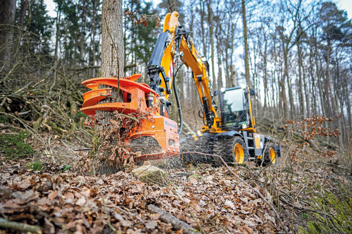 Die Maschinenserie »Woodcracker compact« umfasst zwei verschiedene Größen und ist speziell für den intelligenten Anbau an Bagger entwickelt worden. Die Einsatzgebiete sind sehr vielseitig und umfassen unter anderem Problembaumfällungen, sicheres Abtragen von Bäumen in Teilstücken oder Pflegemaßnahmen entlang von Verkehrswegen und Trassen. Die neue »CS545 compact« wurde für Trägerfahrzeuge mit einem Dienstgewicht von 8 bis 15 t entwickelt, also für kleinere Bagger als die größere »CS610 compact«, die an 15 bis 20 t Bagger angebaut wird. Der Schneiddurchmesser der kleinen CS compact liegt bei 54 cm, bei einem Eigengewicht von 0,61 t (Basisausführung) bis 0,78 t (Vollausstattung). Die CS compact Serie ist mit folgenden Besonderheiten ausgestattet: ein gefederter Sägekasten, der das Einklemmen der Säge verhindert; ein automatischer Kettenspanner, der stets für die richtige Spannung der Sägekette sorgt; eine Sägekettenschmierung mittels Fett, welche Ölvernebelungen der Fahrerkabine verhindert, sowie mit einem kraftvollen Greifer für großes Greifvolumen und sicheren Grip. Optional ist ein endlos drehbarer Tiltator verfügbar. d