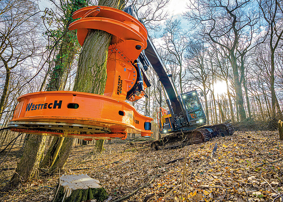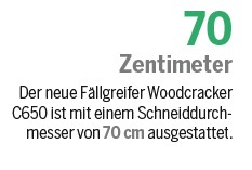 Gleichzeitig, so Westtech weiter, weise der Fällkopf viele weitere positive Eigenschaften auf, die auch bei der gesamten Produktserie zu finden seien. So besteht das Schneidwerk aus einem hochfesten Messer, das einfach nachzuschärfen ist. Muss das Messer nach hoher Abnutzung trotzdem erneuert werden, so kann es aufgrund der patentierten Messerbefestigung rasch demontiert und ausgetauscht werden. Das erforderliche Dienstgewicht des Trägerfahrzeuges soll zwischen 28 t und 40 t liegen. Für sämtliche Funktionen des Woodcracker C650 inklusive aller erweiterbaren Optionen sind nur zwei doppelwirkende Steuergeräte auf dem Trägerfahrzeug notwendig. Die Hydraulikleitungen sind geschützt, groß dimensioniert und führen zu einem gut positionierten Anbaubock. Optional ist ein Power-Tiltator erhältlich. Dieser macht den Fällkopf stärker beim Abtragen von großen Bäumen durch doppeltes Dreh- und Haltemoment bei gleichbleibender Geschwindigkeit.d