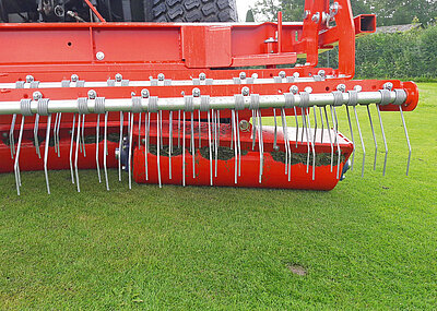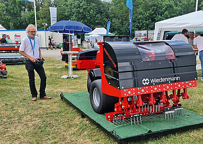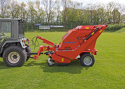 Auf größeren Flächen sollte das Laub besser aufgenommen, statt beiseitegeschafft zu werden. Rasenkehrmaschinen mit Behältern von 1,6 bis 4,5 m3, wie Wiedenmanns Super-Serie, putzen die Fläche in einem Durchgang frei. Ist der Vertikutierkopf montiert, holt man zugleich noch den Filz aus der Grasnabe. Das wäre dann der Saisonabschluss. Und übrigens der Saisonbeginn im Frühjahr, denn mit dieser Maßnahme beginnen Profis jedes Rasenjahr.