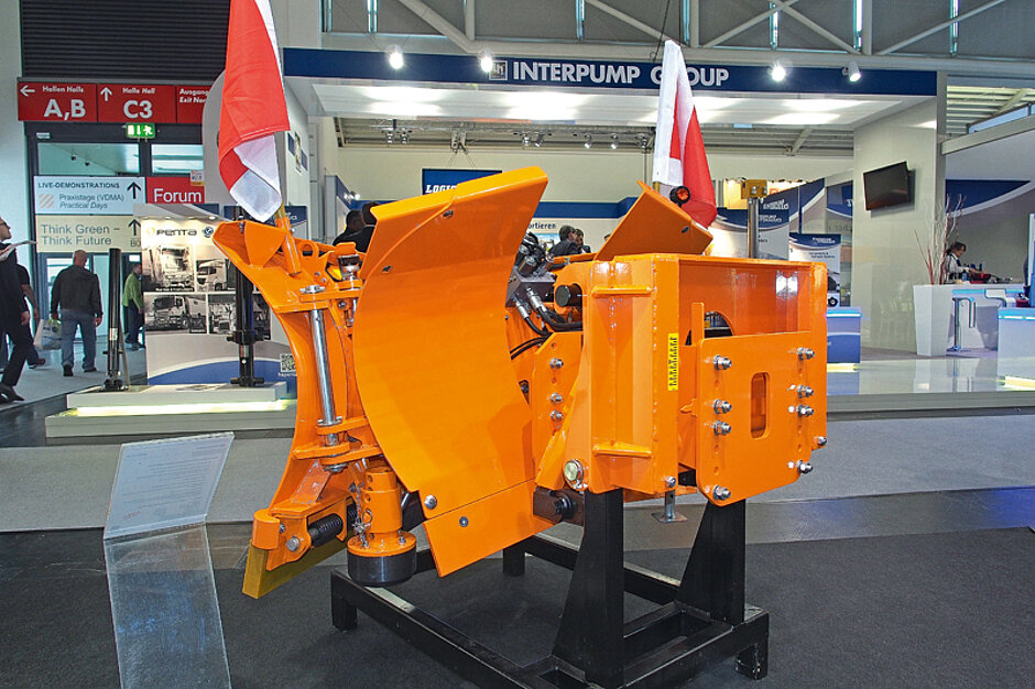 Wiedenmann, Hersteller von Winterdienstgeräten aus Rammingen bei Ulm, hat die neue Lösung entwickelt. Das Zwischenstück verbindet die Radladerschwinge mit dem Anbaugerät, das ansonsten nur an Kompakttraktoren passt. Es schafft zudem einen Niveau- und Lastausgleich, sodass die Laderschwinge nicht auf das Schild drückt. Durch den integrierten Pendelausgleich werden Bodenunebenheiten ausgeglichen.