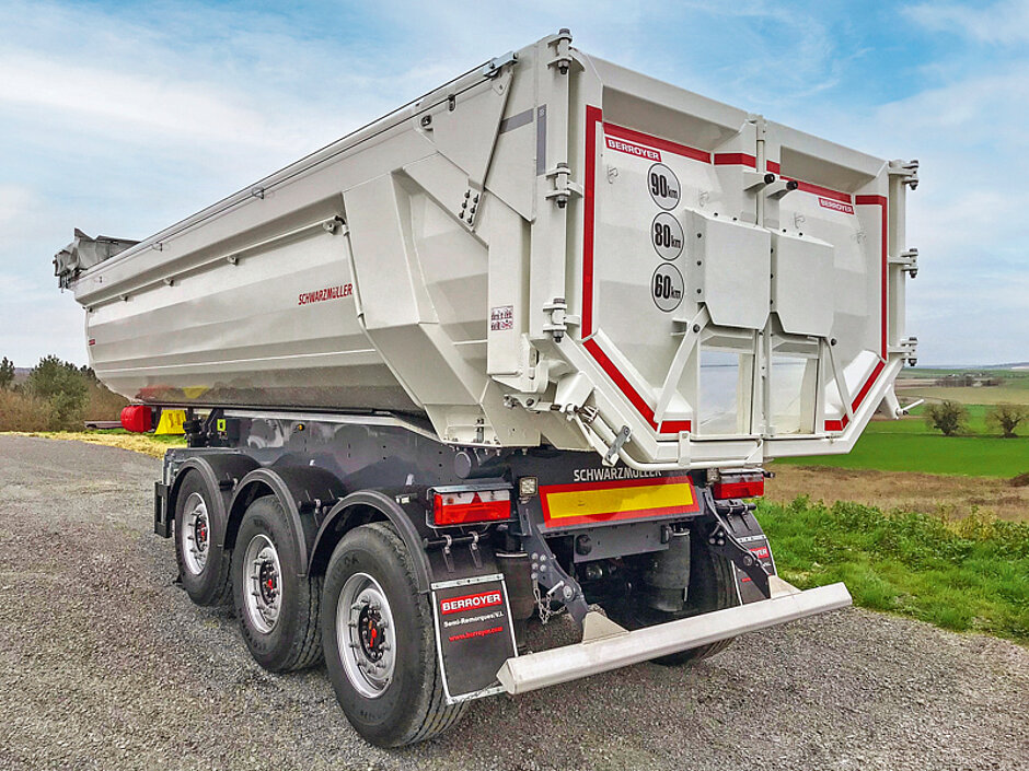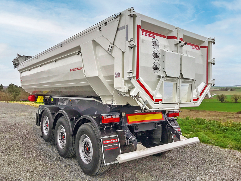 Mit einer Kippervariante hat die Schwarzmüller-Gruppe ein für den französischen Markt optimiertes Fahrzeug konstruiert. Der österreichische Hersteller, der in Frankreich durch den Händler Berroyer vertreten ist, hat es mit einem neu entwickelten Heck geschafft, die nahezu multifunktionalen Anforderungen der Transporteure zu erfüllen. Die Rückwand des Kippanhängers lässt sich mit einer Hydraulik jederzeit nach oben öffnen und kippt nicht nur beim Entladevorgang auf. In der Folge stellen auch große Steine sowie lange Teile beim Transport kein Problem dar. Das Heck ist überdies geteilt und lässt sich über zwei Türen seitlich öffnen. So steht die Mulde auch dann in voller Breite offen, wenn die Hydraulik bei Platzmangel nicht eingesetzt werden kann. Zusätzlich sind in die Rückwand zwei Asphaltschieber eingebaut, um Mischgut an kleinere Straßenfertiger abzugeben. Somit kann ein Fahrzeug nicht nur Schüttgut, schwere Steine und lange Güter, sondern auch heißen Asphalt transportieren. t