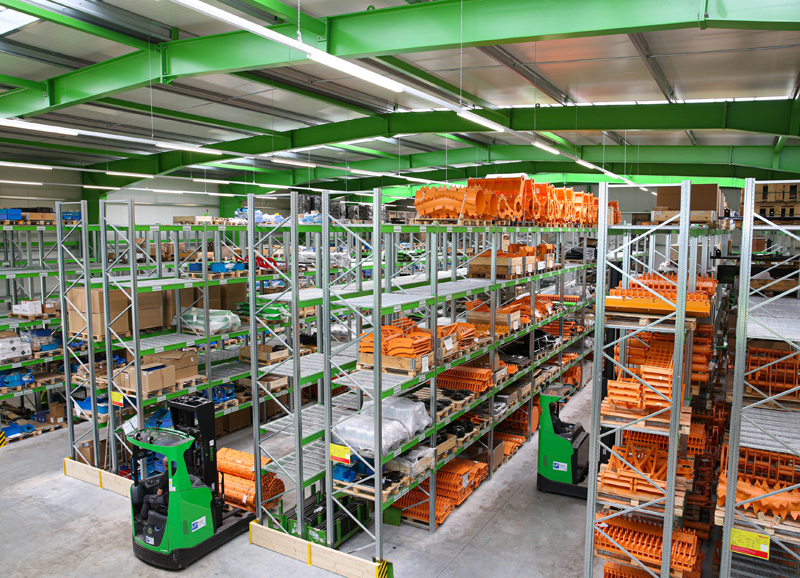 Künftig stehen für den Teilebedarf, sowohl für die Maschinen-Montage als auch für die Kundennachfrage 1.700 qm Nutz- bzw. Lagerfläche, sprich über 2.000 Paletten- und 2.000 Kanban-Plätze zur Verfügung. Damit wird in Zukunft die Materialverfügbarkeit deutlich gesteigert und so die Bereitstellung von Werkzeugen, Ersatz- und Verschleißteilen noch schneller gewährleistet.
