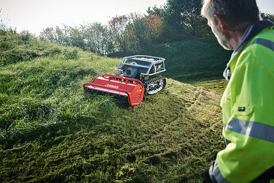 Neben dem Geräteträger CR10 von Herder bietet Wilmers nun auch die leichteren Mähraupen der dänischen Firma Timan an. Durch das geringe Gewicht und die kompakte Bauweise sind die Raupen für kleine steile Hänge und enge Böschungen mit einem Steigungswinkel bis zu 50 ° geeignet. Zudem sind sie leicht und schnell zu transportieren. Beide Raupen werden aus sicherer Entfernung per Fernsteuerung gelenkt. Das Fahrwerk ist mittig gelagert, sodass sich die Raupenbänder dem Gelände anpassen können und den größtmöglichen Kontakt zum Boden haben.