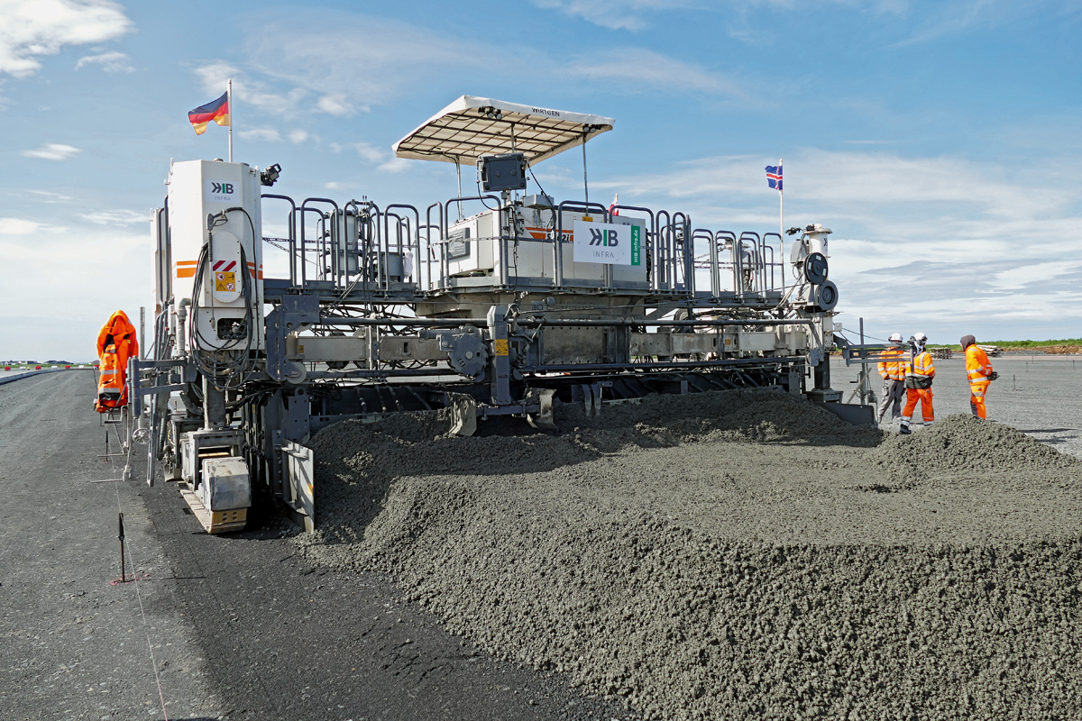 Im Grunde wird Beton immer aus Zement, Wasser und verschiedenen Gesteinskörnungen hergestellt. Um die Anforderungen, die sich aus der späteren Beanspruchung des Bauwerks ergeben, erfüllen zu können, bedarf es weiterer Zuschläge und einer exakteren Betrachtung der genannten Hauptkomponenten. Die Anforderungen bei der Erweiterung des Flughafens Keflavík umfassten zum Beispiel einen Beton mit der Druckfestigkeitsklasse C35/45. Um die Druckfestigkeit von 45 N/mm² (kubischer Probekörper) zu erreichen, wurde die Betonrezeptur in Begleitung von Wirtgen-Anwendungstechnikern abgestimmt und für den Einbau mit dem Gleitschalungsfertiger optimiert. Ohne Probefelder konnte sofort in situ mit den ersten Pilotbahnen begonnen werden. Diese zeigten eine optimale Qualität in allen geforderten Parametern Verdichtung, Druckfestigkeit, Ebenheit, profilgerechte Lage und Oberflächenrauheit bzw. Griffigkeit.