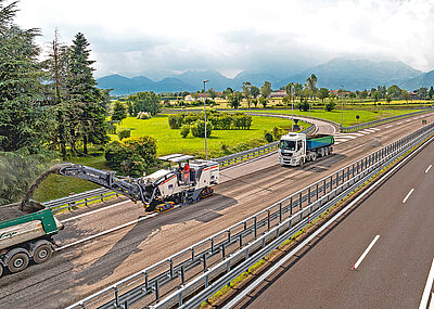 Die Kaltfräsen arbeiteten versetzt, um die 45 Muldenkipper im fliegenden Wechsel kontinuierlich mit Fräsgut zu »füttern«. Dabei beeindruckte die Maschinengeneration auch erfahrene Fräsenfahrer wie Valentino Pivotto vom Fräsdienstleister Crestani, »nicht nur, weil es der erste Einsatz nach der Maschineneinweisung war.« Nach Jahren saß der Bediener erstmals wieder auf einer Wirtgen-Fräse. »Daher war der Sprung mit der W 210 Fi in Bezug auf Steuerung, Leistung und Produktivität enorm. Ganz zu schweigen vom Dual Shift, das diese Maschine zu einem echten Maßstab macht.«