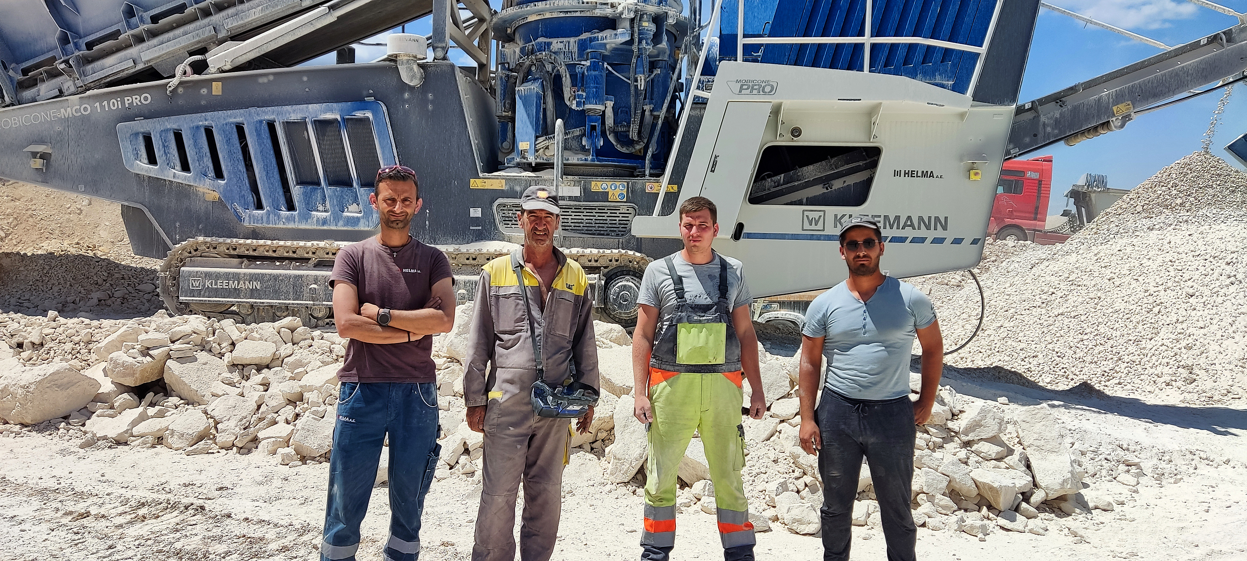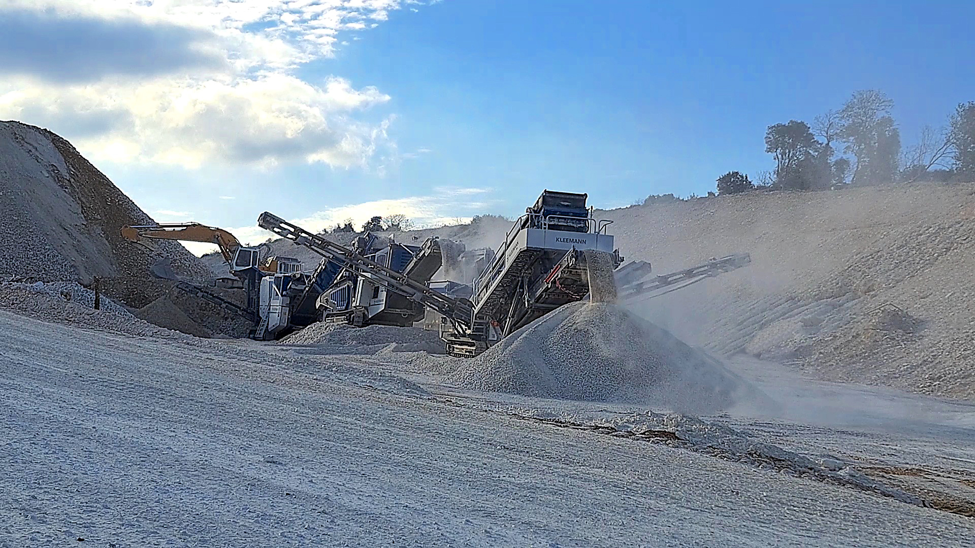Der Kalkstein vor Ort verfügt über einen hohen Quarzgehalt. Das Aufgabematerial (Aufgabegröße 0-600 mm) ist sehr klebrig und enthält neben Quarz auch einen hohen Anteil an Erde. Ein ideales Einsatzgebiet für den Backenbrecher Mobicat MC 120i Pro, der als Vorbrecher im Anlagenzug eingesetzt wird und mit seinem leistungsstarken Doppeldecker-Vorsieb überzeugen kann. Damit werden die Feinanteile bereits vor dem Brechprozess ausgetragen. Der Backenbrecher beschickt den nachgeschalteten Kegelbrecher Mobicone MCO 110i Pro, während die Kleemann Siebanlage die vier für den Straßenbau vorgeschriebenen Endprodukte liefert: 0-4, 4-16, 16-32 und 0-32.