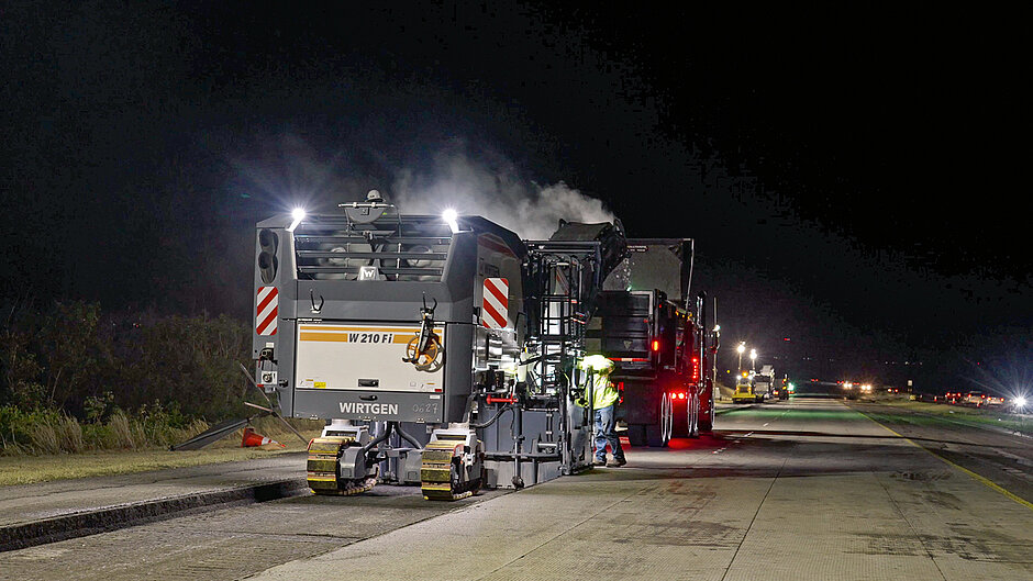Ursprünglich war geplant, mit der Fräse in einem ersten Arbeitsgang die 10 cm starke Betonschicht abzutragen und dann in einem zweiten Schritt die Tragschicht zu entfernen. Die Wirtgen-Großfräse schafft es jedoch, die gesamten 20 cm in einem einzigen Arbeitsschritt abzutragen. Dadurch konnten beim Abtragen der Fahrbahndecke pro Arbeitsschicht 60 bis 90 m zusätzlich ausgebaut werden. Daraufhin konnten die Straßenbauer in einer 8- bis 10-Stunden-Schicht 600 m pro Nacht fertigstellen. »Dass der Umstieg auf die Wirtgen-Fräsen ein reibungsloser Erfolg war, ist nicht nur ihrer Wirtschaftlichkeit zu verdanken, sondern auch der schnellen Lieferung von Teilen durch Pape (lokaler John-Deere/Wirtgen-Group-Händler) und der von der Wirtgen Group durchgeführten Schulung«, so Zack Gonzales, General Manager von Maui Paving.s