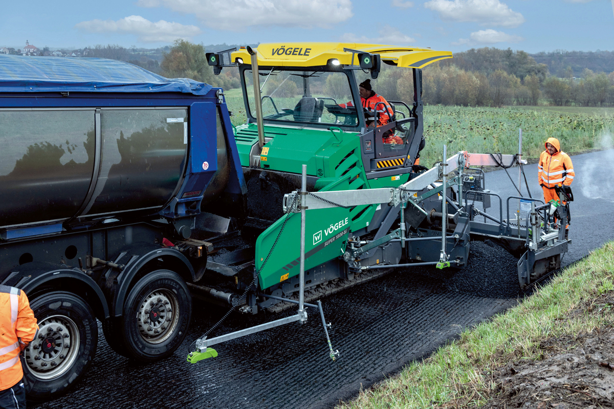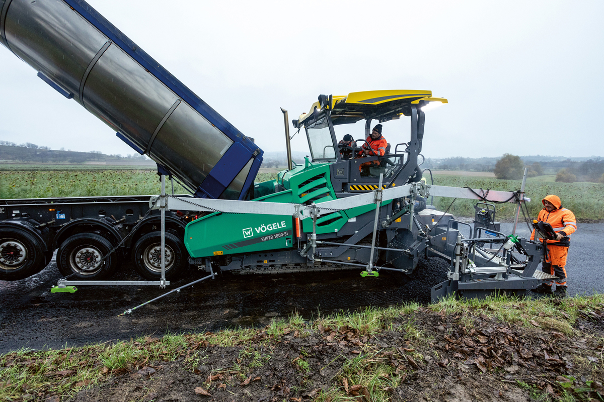 Um eine hohe Einbauqualität zu erreichen, musste die Bedienmannschaft unter anderem eine ruckfreie Beschickung und gleichmäßige Materialzufuhr gewährleisten. Auch hier profitierten Gutmann und sein Team von einigen technischen Neuerungen der Strich-5-Fertiger: Der optimierte PaveDock Assistant von Vögele erleichterte die Kommunikation bei der Mischgutübergabe. Mit den Signalampeln rechts und links des Fertigerdachs gab der Fertigerfahrer dem Lkw-Fahrer eindeutige Anweisungen: Grün für Zurücksetzen und Andocken, Rot für Stoppen. Der gefederte Abdruckbalken PaveDock nahm die Stöße des Mischgut-Lkw effektiv auf, sodass sie nicht auf den Fertiger und damit den Asphalt übertragen wurden. Da die zugehörigen Abdruckrollen bei den Strich-5-Fertigern zusätzlich pendelnd aufgehängt sind, konnte der Lkw auch in den Kurven ruckfrei andocken und beschicken.