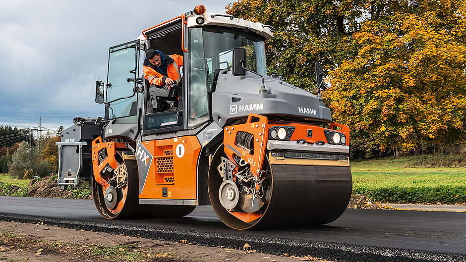 Auch die batterie-elektrischen Tandemwalzen HD 10e und HD 12e können bei der Verdichtung von temperaturabgesenkten Asphalten eingesetzt werden. Als einziger Hersteller bietet Hamm in diesem Segment Varianten mit Oszillationsbandage und Reifensatz an. Dieser kann zusätzlich mit thermischen Schürzen ausgestattet werden. Ein Abkühlen der Reifen wird dadurch verhindert, zusätzlich kommen bei diesen Modellen alle Vorteile der Oszillation zum Tragen.