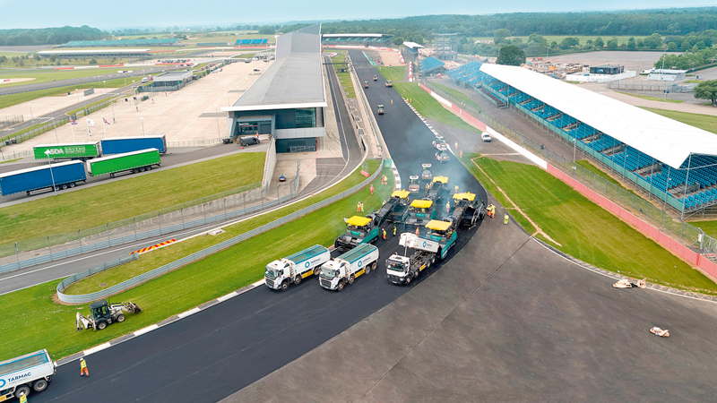 Fast schon eine Wissenschaft für sich war bei der Baumaßnahme in Silverstone das Thema Asphalt. So entfernte Tarmac einen Großteil der enthaltenen Feinanteile aus dem gebrochenen Gestein durch Waschen. Danach bereiteten zwei Benninghoven-Asphaltmischanlagen an den Tarmac-Standorten Elstow und Harper Lane daraus frisches Mischgut auf. Trotz anspruchsvoller Rezepturen mit Bitumen- und Hightech-Zuschlagstoffen konnten die Anlagen die streng kontrollierten »Formel 1«-Qualitätsstandards einhalten. Das Ergebnis ist ein hochstandfester Asphaltbelag, der darauf ausgelegt ist, hartem Bremsen und extremen Querkräften langfristig zu widerstehen. Dadurch ist auch das Risiko neuer Bodenwellen deutlich reduziert. Neben der Asphaltproduktion war auch die Baustellenlogistik anspruchsvoll: Es galt, 360 t/h Asphalt an die Strecke zu transportieren.