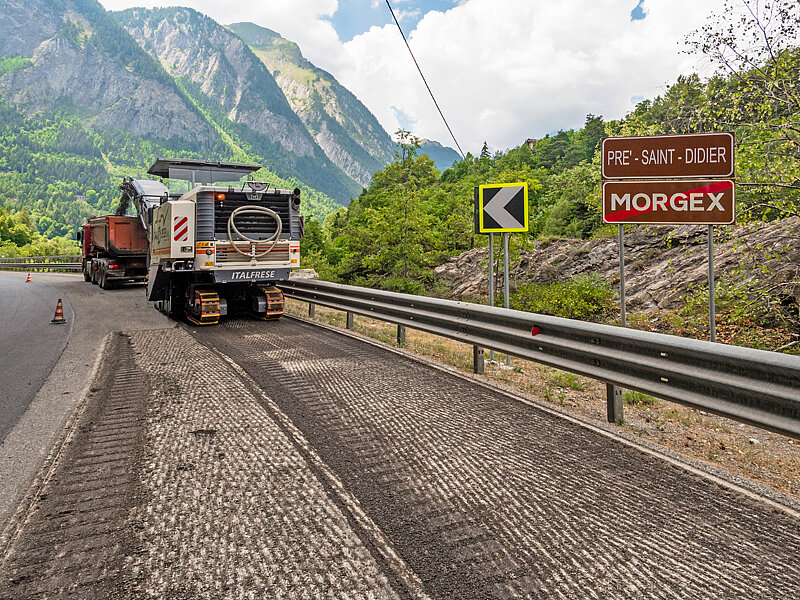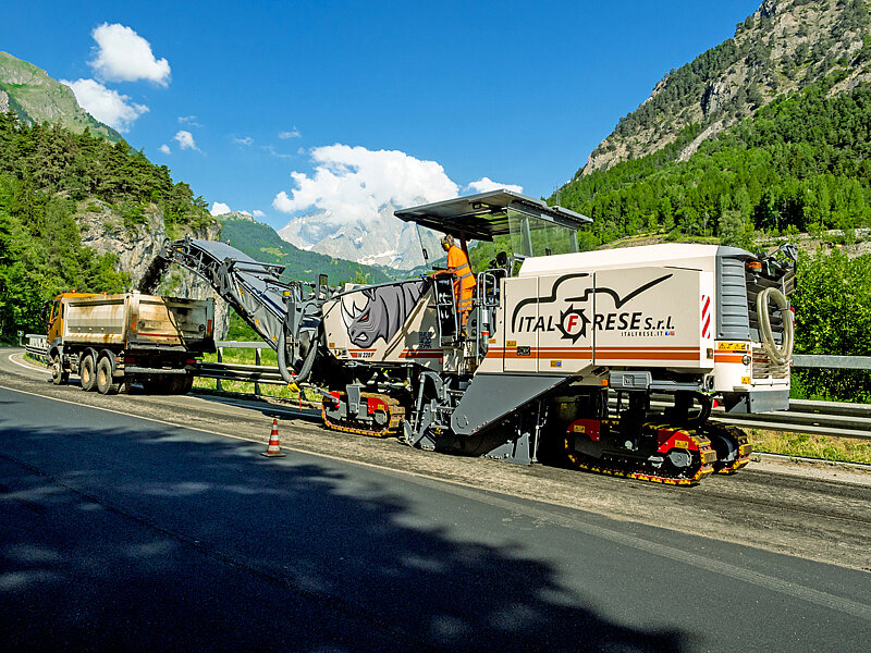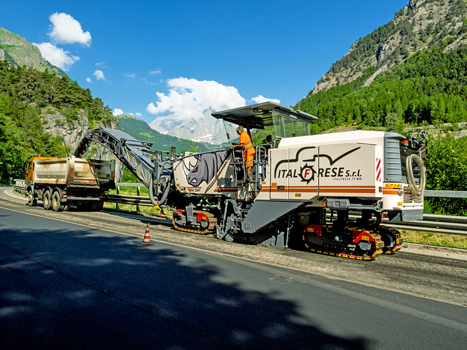 Weil die Vollsperrung der Strecke in den Alpen nur schwer realisierbar ist, erfolgte die Sanierung der SS 26 im Juli und August 2018 unter halbseitiger Sperrung. Dabei gelang es der beauftragten Italfrese s.r.l., einem der größten italienischen Fräsdienstleister mit Sitz im Piemont, durch den Einsatz der W 220 die Bauzeiten zu beschleunigen. Ein Grund dafür: Die Maschine kann 2,20 m in einem Übergang abtragen. Dadurch waren in den meisten Bereichen nur 2 statt 3 Überfahrten notwendig. Zudem arbeitete die Fräse mit einem Maschinenvorschub von 28 m - 30 m/min – und das sogar bei Steigungen von ca. 5 %. Schlussendlich benötigte der Fräsdienstleister für das Fräsen nur die Hälfte der Zeit, die mit kleineren Maschinen – diese kommen üblicherweise bei engen Abschnitten wie denen auf dem Alpenpass zum Einsatz – veranschlagt worden wäre. Und das ohne Qualitätseinbußen.