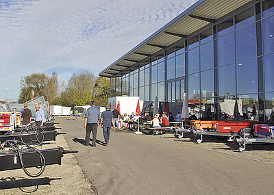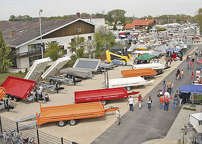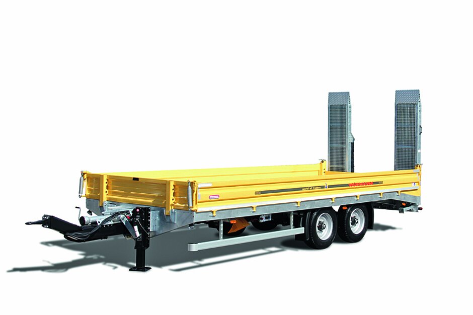 Ebenso ist die abgeschrägte Ladefläche auf den Transport von schweren Maschinen oder Materialien ausgerichtet. Die profilierten und lasergeschweißten Stapler-Stahl-Seitenbordwände sind 40 cm hoch und werden in Wunschfarbe lackiert. Für eine Beladung können die Seitenwände mittels Bordwandfederheber abgeklappt und abgenommen werden. Eine Durchladung wird durch die liegend angeordnete Deichselhöhenverstellung sowie die klappbare Stirnwand ermöglicht.