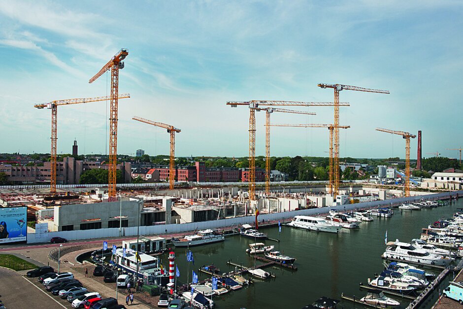 Acht gelbe Wolff-Krane in den Hausfarben des ausführenden Bauunternehmens STRABAG Belgium sorgen in der Hauptstadt der Provinz Limburg dafür, dass das Material auf der Baustelle des »Quartier Bleu« von A nach B gelangt. Schnelle Montagen sowie exakt aufeinander abgestimmte Turmhöhen sorgen für einen reibungslosen Baufortschritt trotz beengter Platzverhältnisse.