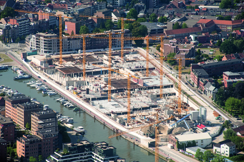 »Da alle Krane freistehend sind, wurden sie in massiven Betonfundamenten verankert. Dabei haben wir auf die zweiteilig aufgebauten Wolff-Fundamentanker zurückgegriffen, deren Zapfenteil für den Turmanschluss abgeschraubt und wiederverwendet werden kann. Außerdem nutzen wir beim Wolff 6023.8 clear mit einer Hakenhöhe von 73,5 m Turmstücke mit einem größeren Querschnitt von 2,3 m x 2,3 m«, sagt Frédéric Van Hoorebeke, Geschäftsführer der Wolffkran Belgium. Aus wirtschaftlichen Gründen wurden die Krane inmitten des Bauareals aufgestellt, da so Krane mit geringerer Ausladung und Tragfähigkeiten eingesetzt werden konnten, als wenn die Krane am Rand des Areals platziert worden wären. Die Demontage erfolgt dann wieder mit Mobilkranen, die am Rand des Bauareals aufgestellt werden.