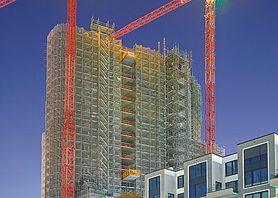 Durch die spezielle Gebäudeform mit der seitlich verschobenen Fassade in der Mitte müssen die Krane rund zehn bis zwölf Meter statt der üblichen fünf bis sechs Meter vom Gebäude entfernt stehen. Das stabile WOLFFKRAN Turmsystem HT 23 ermöglicht es, dass die Wipper trotz ihrer finalen Turmhöhe von über 180 Metern mit nur jeweils vier Abspannungen auskommen. „Mit einem Außenmaß von 2,30 Meter ist das HT 23 so stark und stabil wie ein Turmsystem mit 2,50 Meter Außenmaß, dabei aber schlanker und somit bestens geeignet für die enge Hochhausbaustelle“, so Odenbreit.