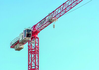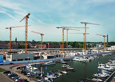 Die beiden 355 B Wipper werden nach und nach mit dem Gebäude bis auf eine Turmhöhe von 184 Metern mitwachsen. Durch ihre fast senkrechte Auslegerstellung und die nur 6,6 Meter langen Gegenausleger sind sie für die beengte Baustelle die idealen Arbeitstiere und können mühelos an den Nachbarbauten sowie dem spitzenlosen WOLFF 6031.8 clear vorbeischwenken. Mit ihren hohen Traglasten von 8,5 (6031.8) und 14 (355 B) Tonnen werden die WÖLFFE für das Heben von Baumaterial und Fertigbauteilen verwendet. „Die teilweise über zwölf Tonnen schweren Unterzüge – Betonträger für Decken und Wände – heben später die beiden Wipper sogar in Teamwork mit einem sogenannten Tandemhub“, erklärt Thomas Odenbreit. „Es werden somit keine leistungsstärkeren Krane benötigt. Das ist für den Kunden die effizienteste Lösung.“