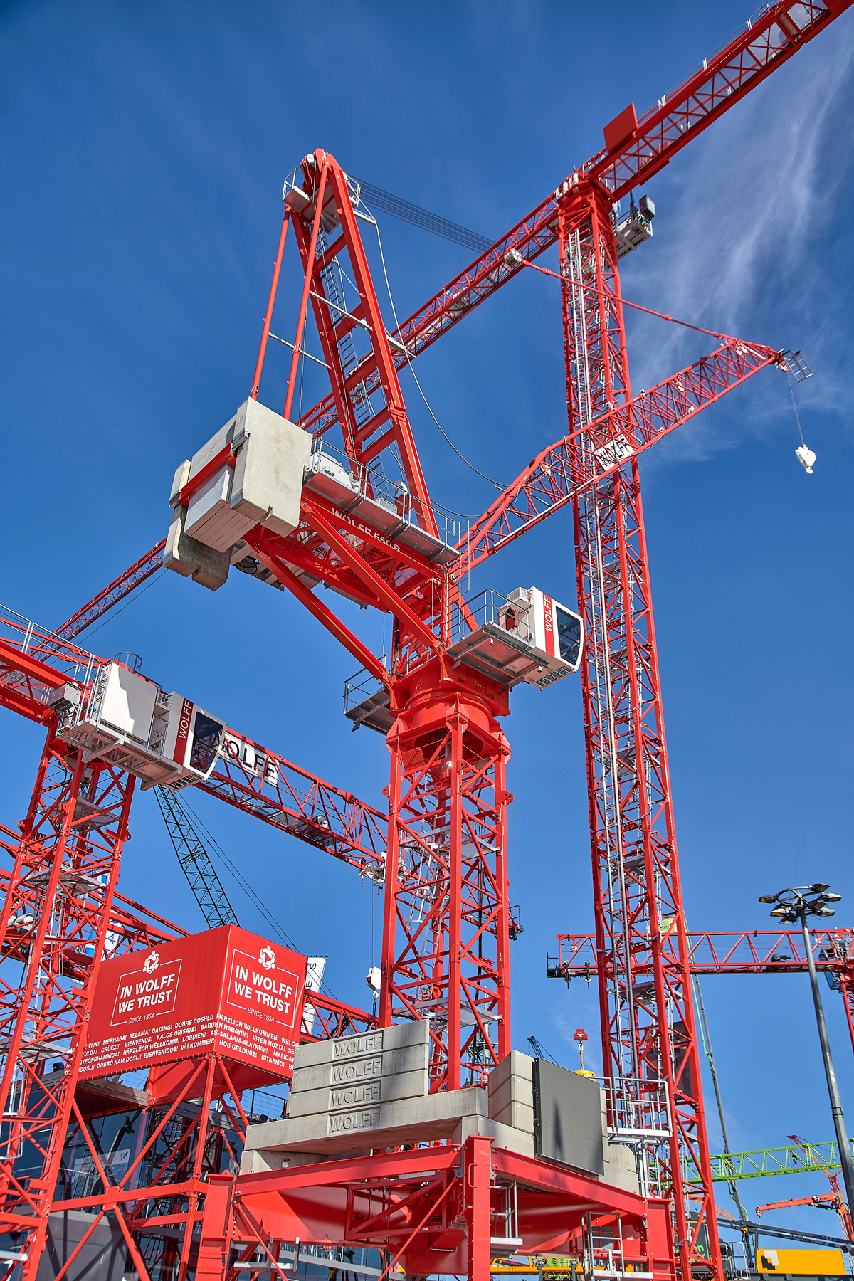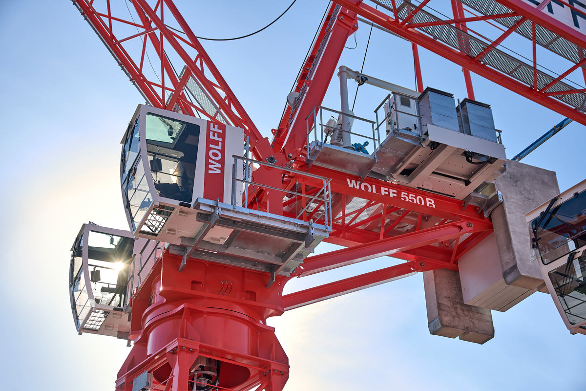 Der »Wolff 550 B« kommt auf einen Hakenweg von 920 m (Einstrang) bzw. 460 m (Zweistrang) und eine Arbeitsgeschwindigkeit bis zu 200 m/min. Zudem verfügt er standardmäßig über einen 2,3-m-Turmanschluss, mit dem frei stehende Höhen bis knapp 52 m möglich sind. Stellt man ihn auf einen 2,9-m-Turm, kann er bis zu 82,2 m ohne Anbindung in die Höhe wachsen, was ihn auch ideal für Hochhausprojekte mache. Passend dazu lasse er sich optimal mit Wolffkrans Innenkletterwerk »KSH 23« kombinieren. Dieses ermöglicht, den Kran in nur einer Kletterphase um fast 27 m zu klettern, was den Zeitaufwand reduziert und die Kosten senkt.