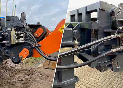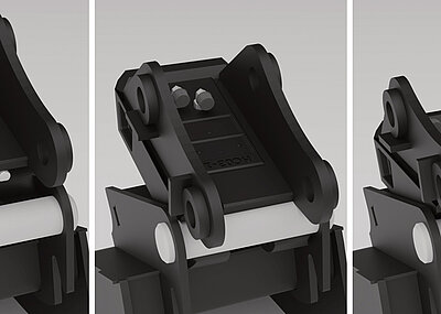 Dabei unterscheidet sich der Arbeitsablauf beim Austausch von Anbaugeräten mit den »LifeLine HC Superior«-Schnellwechslern von außen betrachtet kaum von anderen Systemen. Absetzen und Entnehmen des alten Anbauteils laufen ab wie bisher. Doch ab dann gibt es kleine Unterschiede zum sonst üblichen Ablauf. Sobald das Hydrauliksystem Arbeitsdruck erhält, fährt auch die Klauensicherung des »Superior«-Schnellwechslers automatisch aus und er verriegelt wie gewünscht. Allerdings bleiben die Verriegelungsbolzen leicht eingerückt, weshalb der Fahrer das nächste Anbaugerät aufnehmen kann, ohne erneut zu entriegeln. Wie gewohnt positioniert und senkt der Baggerführer die Klauen über der Aufnahme des neuen Anbauteiles und fädelt sie ein. Die beiden Bolzen der »LifeLine«-Klauensicherung werden dabei von der Aufnahmeachse nach innen gedrückt und klicken, sobald die Klauen richtig sitzen, automatisch wieder aus. Ab jetzt kann das Anbaugerät zwar noch schwingen, ist jedoch in jeder erdenklichen Lage in den Klauen gesichert und fällt selbst bei schnellen Schwenkbewegungen nicht herunter. Die Klauensicherung greift immer zuerst und ist unabhängig von der zweiten Verriegelung, bei der dann die Bott-Ventile zum Einsatz kommen. Dazu senkt der Baggerführer den Wechsler auf die hintere, von ihm abgewandte Aufnahme ab. An der Rückseite des »HC Superior« befindet sich ein federbelasteter Kontaktstift. Dieser wird, sobald der Wechsler richtig positioniert ist, durch die Aufnahmeachse des Anbaugerätes gedrückt und betätigt damit das Sitzventil. Die bisher eingerückten Verriegelungsbolzen fahren nun automatisch aus und verriegeln den Löffel. Erst wenn sie auf ein Sicherheitsminimum ausgefahren sind, fährt auch der rote Anzeigestift ein und zeigt, dass das Anbaugerät sicher verriegelt ist.d
