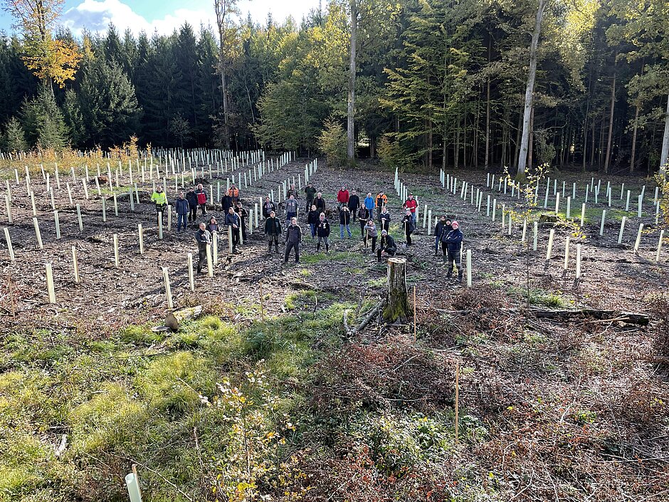 Bereits am 22. Oktober krempelten rund 25 Mitarbeitende und Führungskräfte von Würth MODYF die Ärmel hoch. Unter fachlicher Anleitung wurden 1.020 Bäume, darunter Esskastanie, Roteiche, Walnuss und Flatterulme gepflanzten. Zudem wurden die Setzlinge gegen Verbiss und Fegen geschützt.