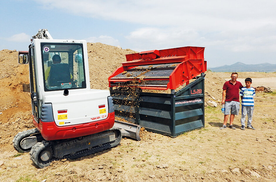 Nun soll rund um die Kindertagesstätte ein Weg aufbereitet werden, der auch mit Rollstühlen befahrbar ist. Dazu wird mit dem Xava-Rüttelsieb LS28 Material der Erdarbeiten auf 0 mm bis 16 mm großes Endkorn abgesiebt, das als Untergrund für den Wegebau eingesetzt wird.