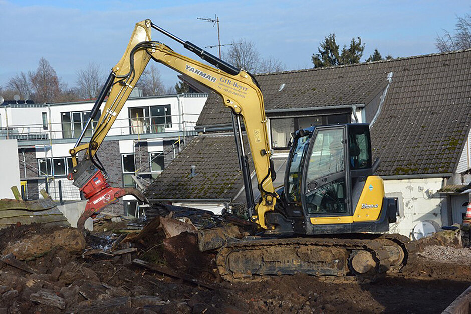 Nach Bezug des neu errichteten Fertighauses Ende 2017 beginnt die GfB-Beyer mbH mit dem fachgerechten Rückbau des alten Gebäudes. Im ersten Schritt wird dieses bis auf die statisch relevanten Bauteile zurückgebaut. Mit Sortiergreifer ausgestattet greift der Yanmar-Kompaktbagger gezielt Fenster, Wände, Holzgerippe und jegliche Baustoffe, die sich am Gebäude befinden und trennt sie sauber. Hierbei zeigen sich besonders die Vorteile der feinfühligen Hydrauliksteuerung bestehend aus zwei vollproportionalen und voreinstellbaren Zusatzhydraulikkreisläufen. Auch die Ausschachtungsarbeiten für die Keller der zwei weiteren Häuser übernehmen die Yanmar-Maschinen.