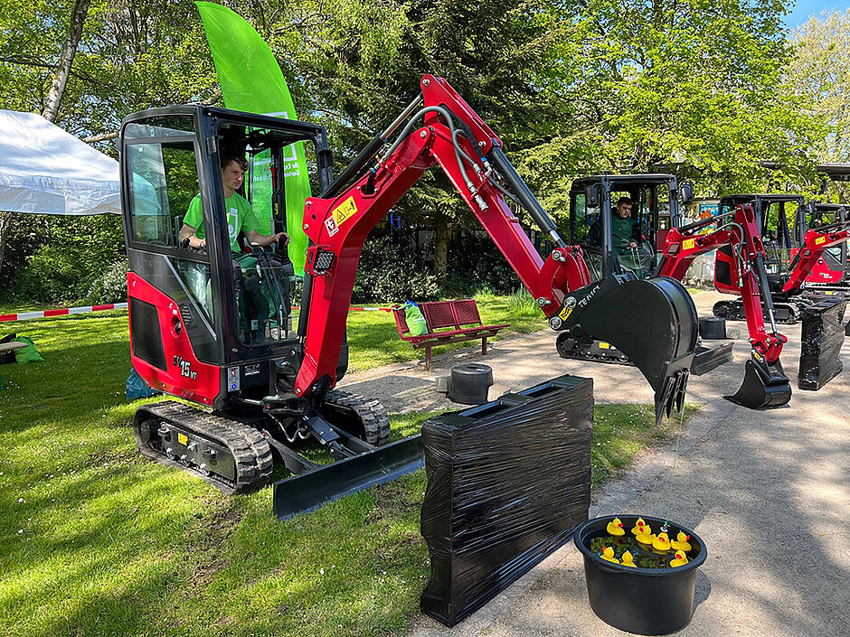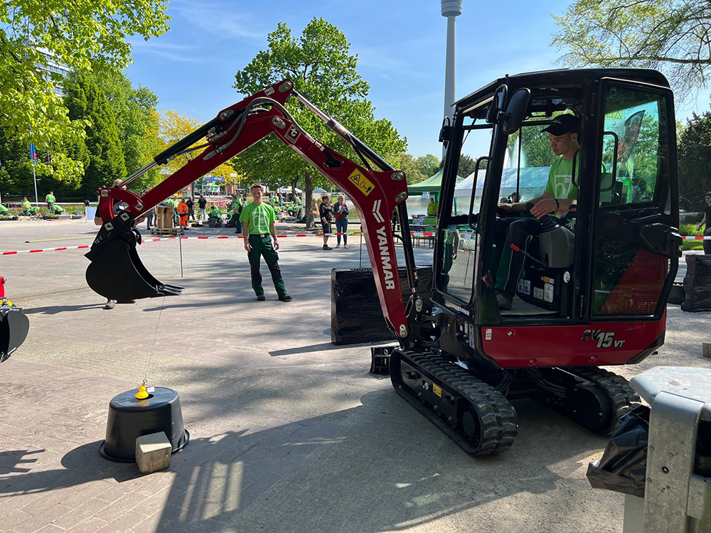 In dem Wettbewerb hatten die Auszubildenden Stationen aus verschiedenen theoretischen und praktischen Bereichen des Garten- und Landschaftsbaus zu bewältigen: Neben einer Bauaufgabe ging es um Vermessung, Pflanzenkenntnis, Pflanzenschutz, Betriebswirtschaft sowie ein „Landschaftsgärtnerisches Spezialgebiet“. Die vier Minibagger von Yanmar kamen im Geschicklichkeitswettbewerb zum Einsatz. Hier mussten die Nachwuchskräfte in Zweier-Teams „Entenangeln“: Dazu wurde an der Baggerschaufel eine Schnur befestigt, an deren Ende sich ein Magnet befand. Angeleitet durch die Befehle des Teampartners sollten die Teilnehmer, die das Arbeitsfeld nicht einsehen konnten, den Magneten präzise an die in einem Wasserbecken schwimmenden Plastikenten heranführen, diese herausziehen und sie in ein zweites Behältnis befördern. Es galt, in je zwei Minuten so viele Plastikenten wie möglich zu angeln. Auch die Einhaltung der Maßnahmen zur Arbeitssicherheit wurde von der Jury mit Punkten bewertet – u.a. Sicherheitsabstände im Gefahrenbereich, Anschnallen in der Kabine und rückwärtiges Aussteigen.