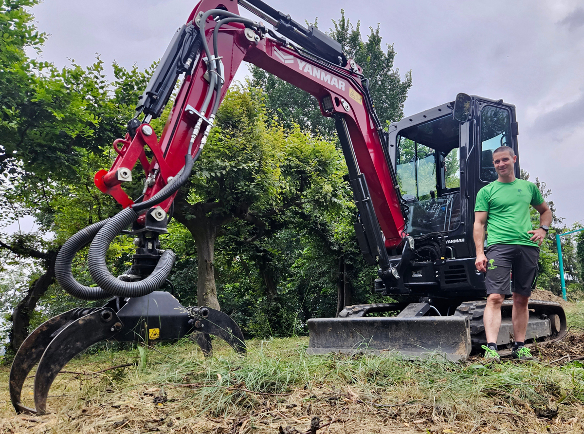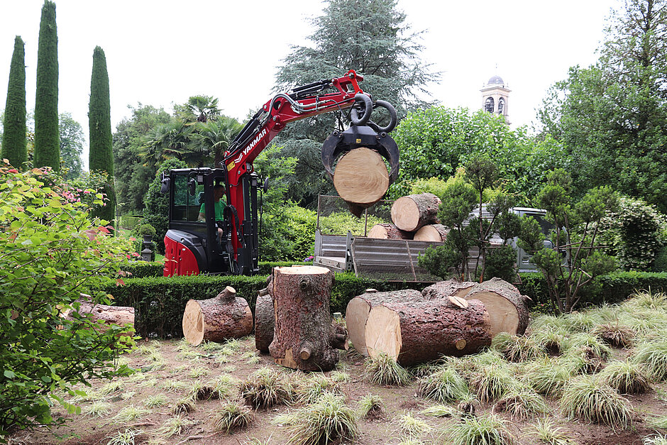 Matteo Vimercati erzählt: „Wir arbeiten seit zwölf Jahren im Park dieser Villa, beschäftigen täglich drei Personen und jetzt auch den Yanmar ViO33-6, der mit verschiedenen Anbauteilen ausgestattet ist. Darunter auch ein Forstgreifer, der beim Fällen von Bäumen und dem anschließenden Verladen und Abtransport der geschnittenen Stämme außerhalb des Anwesens verwendet wird. So können wir sowohl Aushubarbeiten im Park als auch die Baumschnittarbeiten schnell durchführen.“