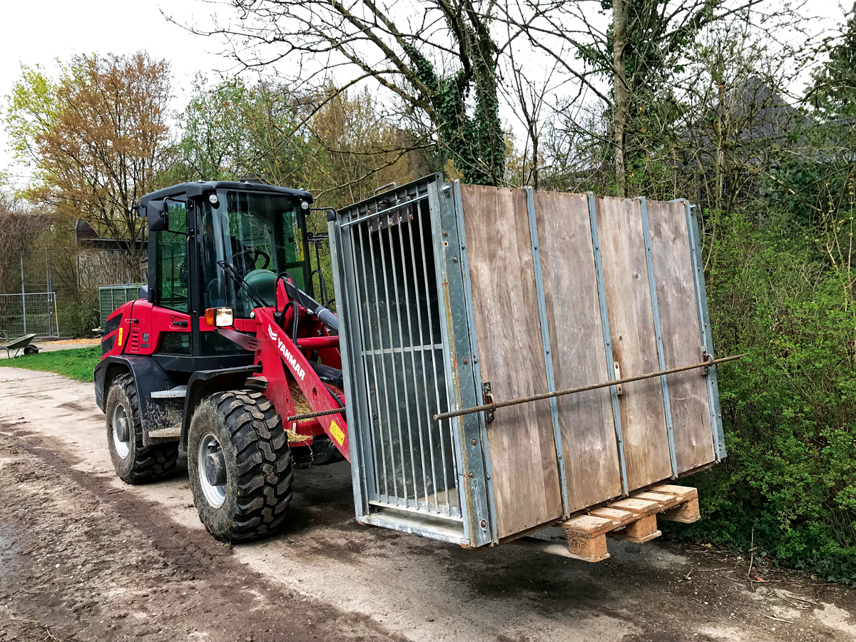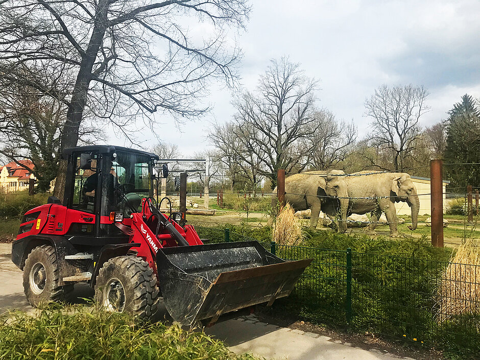 Die über den Yanmar-Händler Fischer u. Schweiger erworbene Maschine musste hohen Ansprüchen gerecht werden: Der Radlader sollte leistungsstark und geländegängig sein und dabei kompakt genug, um problemlos die schmalen Wege und Eingänge zu den Tiergehegen passieren zu können. Gleichzeitig war eine ausreichende Hubhöhe erforderlich, um Container mit Beschnitt- oder Aushubmaterial zu beladen und zu entleeren. Mit diesem Profil wandte sich der Zoo an Fischer u. Schweiger und wurde daraufhin eingeladen, verschiedene Radlader vor Ort auszuprobieren. Der Yanmar V80 überzeugte durch seine kompakten Abmessungen, seine Leistung und die einfache Bedienung.