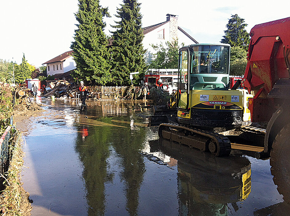 Unmittelbar nach der Katastrophe begannen unzählige Helfer aus nah und fern mit den Aufräumarbeiten. Der Handwerksmeisterbetrieb EHM Mechanik, Services für Maschinen und Anlagentechnik, Yanmar-Vertragshändler und autorisierter Servicepartner mit Herbert Eiblmaier als geschäftsführendem Gesellschafter und Feuerwehrmann war vom ersten Tag an mit seinem umfangreichen Maschinenmietpark und erfahrenen und geschulten Mitarbeitern vor Ort. Bis zu zwölf Yanmar-Bagger und Radlader aller Größen waren über Monate im Einsatz.