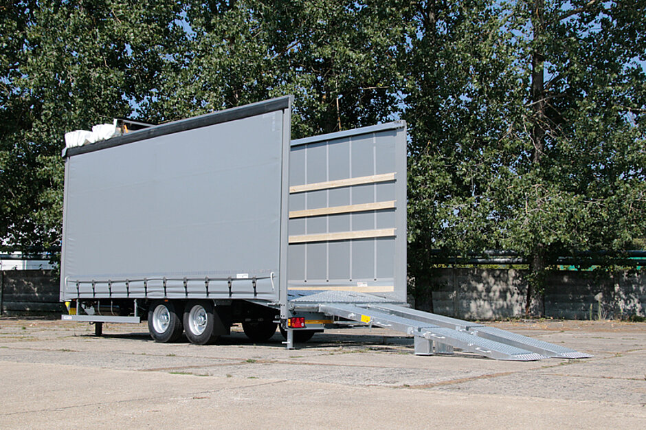 Als Highlight des Tiefladers gilt der Schiebeplanenaufbau. Damit können jetzt hochwertige Geräte auch witterungsunabhängig transportiert oder an den Baustellen abgestellt werden. Auch erfolgt beispielsweise die Maschinenübergabe bei Verkäufern und Vermietern an die Kunden im sauberen und gepflegten Zustand. Die Bediener müssen zudem nicht in den Wintermonaten die Baugeräte enteisen. Der hochwertige Fuhrpark bleibt geschützt und auch vor fremden Augen verborgen. Der Schiebeplanenaufbau kann durch leicht zu bedienende Ratschen von vorn und hinten an beiden Längsseiten geöffnet werden. Ein serienmäßiges Schiebeverdeck erweitert das Einsatzspektrum im Ladevorgang und erlaubt auch eine flexible Kranbeladung für Schwertransporteinsätze u. a. von Maschinen und feuchtigkeitsempfindlicher Ladung. t