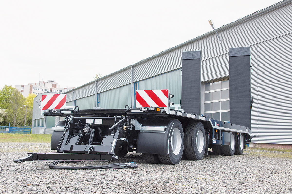 Das Tieflader-Segment bildet den Schwerpunkt von Zandt Cargo auf der Bauma. Der Drehschemelbautyp AT-P 400 beispielsweise ist als leistungsfähiger 4-Achser mit einer durchgehenden Radmulde in der Mitte konzipiert. Die Ein- und Ausfahrbereiche sind flach ausgebildet, um insbesondere bei den Zwei-Wege-Geräten zu punkten. Wird eine durchgängig ebene Plattform für kleinere Baumaschinen, Schalung oder Container benötigt, werden die integrierten Abdeckungen der Radmulden herausgezogen. Im Außenrahmen ist zudem ein Zurrpaket für vielfältige Ketten und Zurrmittel in Serie vorgerüstet.