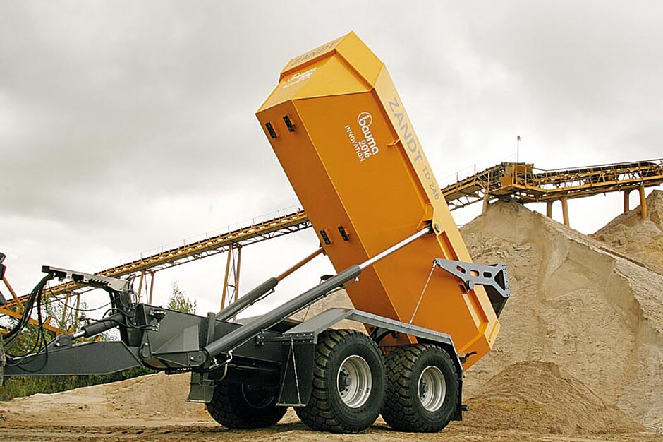 Auf der Steinexpo präsentiert der Anhängerbauer im neuen Konzept den Tandem-Dumper TD 240 für leistungsstarke Traktoren im Gewinnungsbetrieb. »Mit dem Tandem-Dumper TD 240 eröffnen wir eine neue Leistungsklasse im Massenumschlag mit Traktoren. Der Einsatz ist dabei direkt ab Hauwerk, in der Transportlogistik vom Brecher zur Vorratshalde als auch im Auslieferungsbereich über die Straße möglich. Damit ergeben sich neue wirtschaftliche Leistungsparameter in der Logistikkette. Dies ist jedoch nur möglich, da wir mit dem Tandem-Dumper TD 240 ein neues Mulden- und Fahrwerkskonzept realisiert haben, das für härteste Einsatzbedingungen im Gewinnungsbetrieb ausgelegt ist«, erläutert Manfred Zandt die konzeptionellen Grundgedanken.