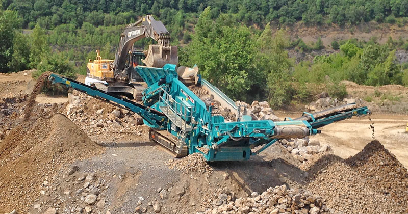 Im Verbund mit der Warrior 2100 arbeitet der 45 t schwere Trakpactor 320 SR, er übernimmt das vorgesiebte Überkorn aus der Warrior. »Jetzt wird die Prallleistung unverfälscht deutlich«, erklärt Rüdiger Christophel die besonderen Eigenschaften der Maschine. »Der schwere, eingezogene 1 100er Rotor verfügt über ein gewaltiges Trägheitsmoment. Bereits hier erfolgt 80 % der Zerkleinerungsleistung. Dass die 257 kW und der teure Dieselkraftstoff zu 100 % am Brechkorn ankommen, stellt der Dieseldirektantrieb sicher. Konsequent wird die Umsetzung der Energieeffizienz durch die hydraulisch abgestützten Prallwerke. Hier verpufft keine Energie in gestauchten Federn oder bewegten Prallwerken. Der Spalt bleibt konstant und der Stein wird gebrochen. Lediglich beim Fremdkörpereintritt öffnen die Prallwerke und lassen den Störstoff passieren«, erläutert Christophel. Die Maschine wird als Kombianlage mit angehängtem 1 500 x 3 300 mm großem Doppeldeckerzwangssieb gezeigt. Der Trakpactor 320 SR punktet im mittelharten Natursteineinsatz und im Bauschuttrecycling gleichermaßen.