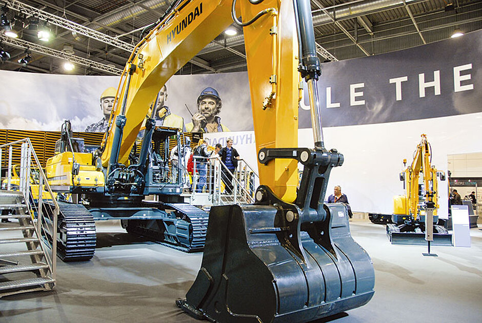 Zu den »Stars« auf dem Messestand von Hyundai gehörten der 52-t-Raupenbagger HX520 L, der von einem 331 kW starken Scania D13-Motor angetrieben wird, und der Radlader HL955, dessen Cummins-Motor über eine Leistung von 149 kW verfügt. Der südkoreanische Hersteller ist zuversichtlich, dass diese von Grund auf neu konzipierte 15-t-Maschine in der 2,8-m³-Klasse eine wichtige Rolle auf dem hart umkämpften europäischen Radlader-Markt spielen wird. Die komplette HX-Serie von 12,5 t bis 90 t soll bis Ende 2015 für Kunden in Europa verfügbar sein. Gleiches gilt für die Radlader der HL-Reihe, die Modelle mit einem Schaufelvolumen von 1,3 m³ bis 7 m³ umfassen wird. iwu