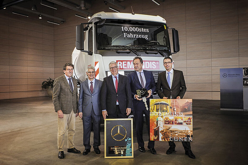 Übergeben wurde der Jubiläums-Arocs von Andreas Schmid, Leiter Mercedes-Benz Lkw Vertrieb und Services Deutschland: »Wir möchten uns herzlich für das Vertrauen bedanken, das die Unternehmen der Rethmann-Gruppe der Marke Mercedes-Benz in den vergangenen mehr als fünf Jahrzehnten entgegenbrachten. Auch in Zukunft werden wir unser vollstes Engagement darin setzen, dieses Vertrauen zu bestätigen und unsere Produkte und Dienstleistungen zur Zufriedenheit des Kunden weiterzuentwickeln.« Bei dem Jubiläums-Fahrzeug handelt es sich um einen Mercedes-Benz Arocs 3236 L 8x4. Der 32-Tonner verfügt mit dem OM 470-Motor mit 10,7 l Hubraum und 265 kW (360 PS) über einen schadstoffarmen Euro-VI-Motor. In Verbindung mit dem automatisierten Mercedes-PowerShift-3-Getriebe steht er für Kraftstoffeffizienz und minimierten CO2-Ausstoß bei besten Fahrleistungen.