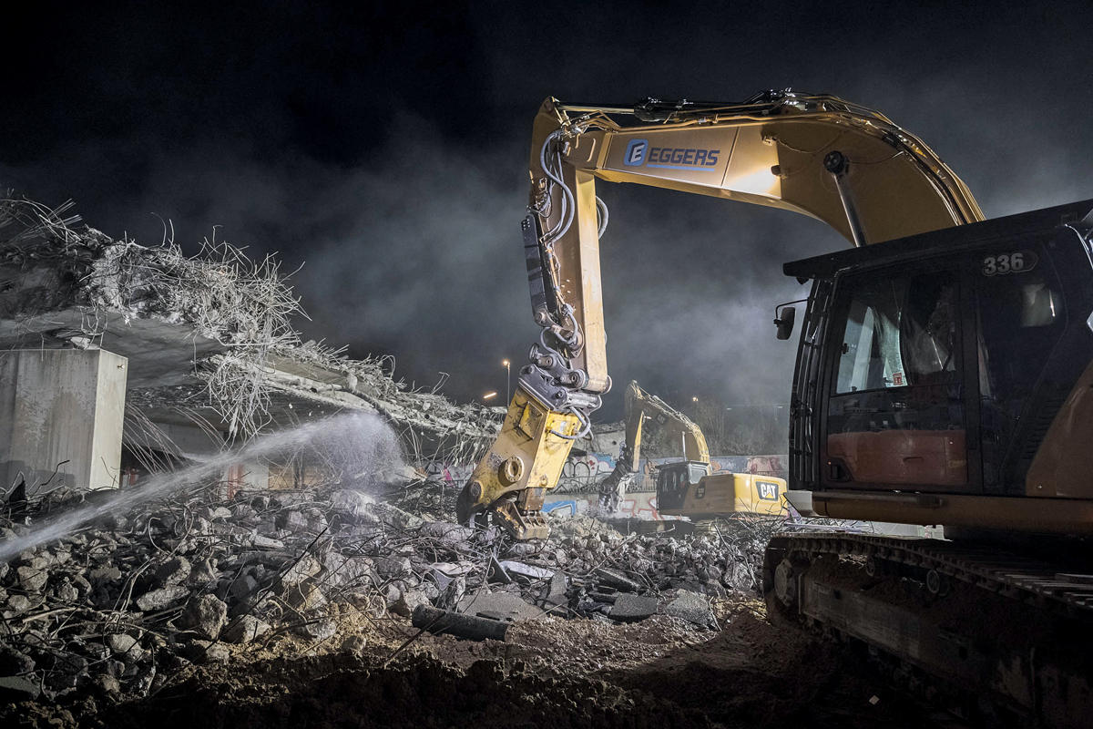 Zum Job gehört auch der Rückbau von rund 205 000 m2 Asphaltoberbau, die abgefräst und entsorgt werden müssen. Boden und Bauschutt in Höhe von 450 000 m3 gilt es ebenfalls abzutragen, abzubrechen und zum großen Teil auf den vom Auftraggeber zur Verfügung gestellten Bodenzwischenlagerflächen zum späteren Einbau in die seitlichen Verfüllbereiche zwischenzulagern bzw. einer fachgerechten Entsorgung zuzuführen. Die ersten drei halbseitigen Brückenbauwerke Behringstraße, Osdorfer Weg und Bahrenfelder Chaussee wurden 2021 im Zuge von Wochenendsperrungen abgebrochen, weitere drei folgten bis Ende 2023. Da es sich bei den halbseitig verbleibenden Brückenbauwerken vor allem beim Osdorfer Weg um größere Bauwerke als in den anderen Bauabschnitten handelte und der Abbruch nur einseitig erfolgen konnte, war für den Abbruch eine Vollsperrung der A7 von 79 Stunden erforderlich. Besonders das kleinste Brückenbauwerk der Bahrenfelder Chaussee machte den Rückbau aufgrund des hohen Anteils an Bewehrungsstahl nicht leicht. Um die Einschränkungen für die Verkehrsteilnehmer zu minimieren, wurden die zwei Brückenbauwerke Osdorfer Weg und Bahrenfelder Chaussee zeitgleich mit der Brücke Kielkamp/Lutherhöhe abgebrochen.