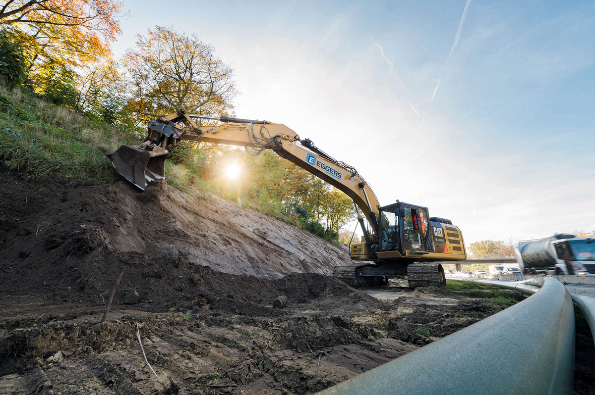 Was den Materialeinsatz betrifft, ist Massenbewegung im großen Stil angesagt. Zum Leistungsumfang, der die Eggers-Gruppe betrifft, zählt der Einbau von 280 000 m2 Geokunststoffen. Jeweils 150 000 t Schottertragschicht und Frostschutzschicht müssen aufgebracht werden. Darüber hinaus sind 430 000 t Sand zu liefern und einzubauen. 585 000 m3 Boden hat das Eggers-Team abzutragen. Das Prozedere für rund 373 000 m3 dafür: erst zwischenlagern und dann aufbereiten für den Einbau. Auf einer Fläche von 64 000 m2 muss der Boden im Baumischverfahren verbessert werden. Zur Bodenbehandlung des zwischengelagerten Bodens werden 5 700 t Bindemittel eingesetzt.