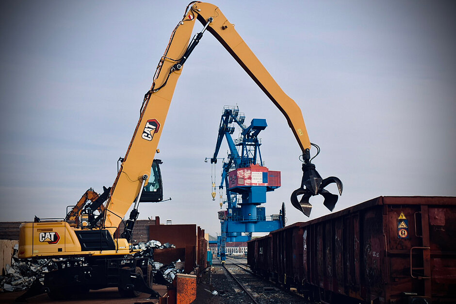 Worauf es ankommt, ist eine robuste Lösung. Ausleger, Stiel und andere stark beanspruchte Bereiche sind beim Cat MH3050 aus dicken, mehrteiligen Platten, Guss- und Schmiedeteilen gefertigt, um der Materialermüdung standzuhalten und einen jahrelangen, störungsfreien Betrieb zu gewährleisten. Gearbeitet wird am Standort Dresden im Zwei-Schicht-Betrieb. Für Feinarbeit, das Sortieren, steht ein kleineres Gerät bereit. Die grobe und schwere Arbeit ist dem Cat MH3050 vorbehalten. Umschlagbagger arbeiten auf dem Gelände Hand in Hand zusammen und leisten die Vorarbeit für Presse und Schere. „Wir bewältigen am Standort Dresden großes Volumen“, so Thomas Schmieder. Was im anspruchsvollen Materialumschlag im Schrott- als auch im Hafeneinsatz zählt, sind Zuverlässigkeit. „Der Umschlagbagger muss funktionieren. Mir bringt es nichts, wenn ich den Bagger nicht einsetzen kann und drei Tage ins Land gehen, bis ein Techniker an der Maschine ist. Ich erwarte kurzfristig eine Rückmeldung, wann es wie weitergeht. Bis jetzt haben wir hier nichts zu beanstanden“, stellt Ralf Gandert dar. Service und kurze Reaktionszeiten waren ein weiteres Argument für Zeppelin-Cat. „Uns wurde zugesichert, dass ein Servicetechniker der Niederlassung Dresden schnell vor Ort sein kann. Cat ist in der Region im Tiefbau stark vertreten, somit sind wir überzeugt, dass wir in Zukunft in guten Händen sind“, ist Thomas Schmieder überzeugt. Aber vorerst dürfte hier bei der neuen Technik ohnehin nichts anfallen, was den Prozess der Aufbereitung für den Wertstoffkreislauf stören könnte.