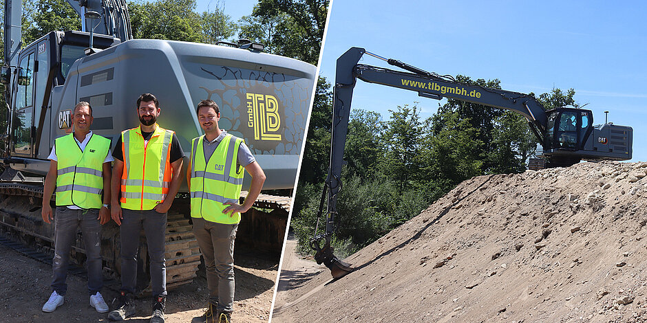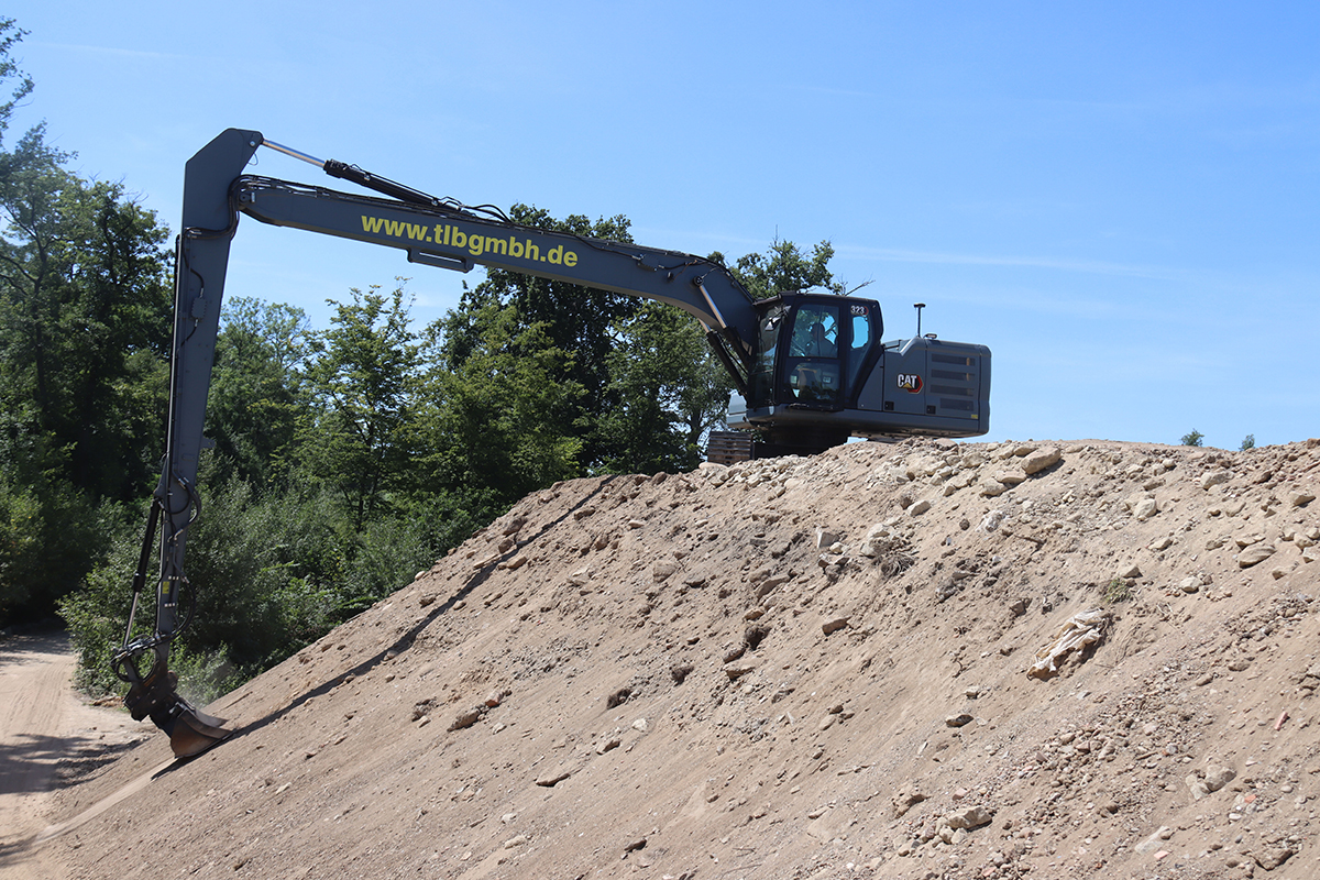Baggern im Blindflug: Taucht ein Ausleger unter Wasser ein, damit der Bagger mit seinem Löffel einen Baggersee auskiesen kann, muss der Baggerfahrer in der Regel seiner Erfahrung und seinem Bauchgefühl vertrauen. Denn sobald der Löffel unter der Wasseroberfläche verschwunden ist, kann sich der Maschinist nur noch rantasten, wann er den Löffel abzieht und füllt. Das muss anders gehen, dachte sich Christian Glaßer, Geschäftsführer von TLB. Das auf Tiefbau, Logistik und Bodenverwertung spezialisierte Unternehmen aus Hagenbach im Südosten von Rheinland-Pfalz nutzt erstmals in Deutschland eine 3D-Steuerung an einem Cat Kettenbagger 323 in der Ausführung SLR und das Ganze neben der klassischen Profilierung für das Auskoffern und für Böschungsarbeiten unter Wasser.