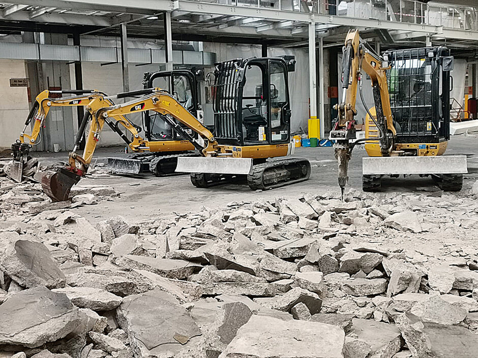 Mit den Baumaschinen führt A&S aktuell einen Werksabbruch während laufender Produktion aus. Die Minibagger haben für eine höhere Standsicherheit ein Zusatzkontergewicht von 120 kg erhalten. Die zugewiesenen Abbruchfelder sind rund 50 m² bis 100 m² groß. »Was wir da machen, wurde früher hauptsächlich mit wesentlich kleineren Dieselgeräten oder gar per Hand mit Schlaghammer und Stemmeisen erledigt«, berichtet der Geschäftsführer.