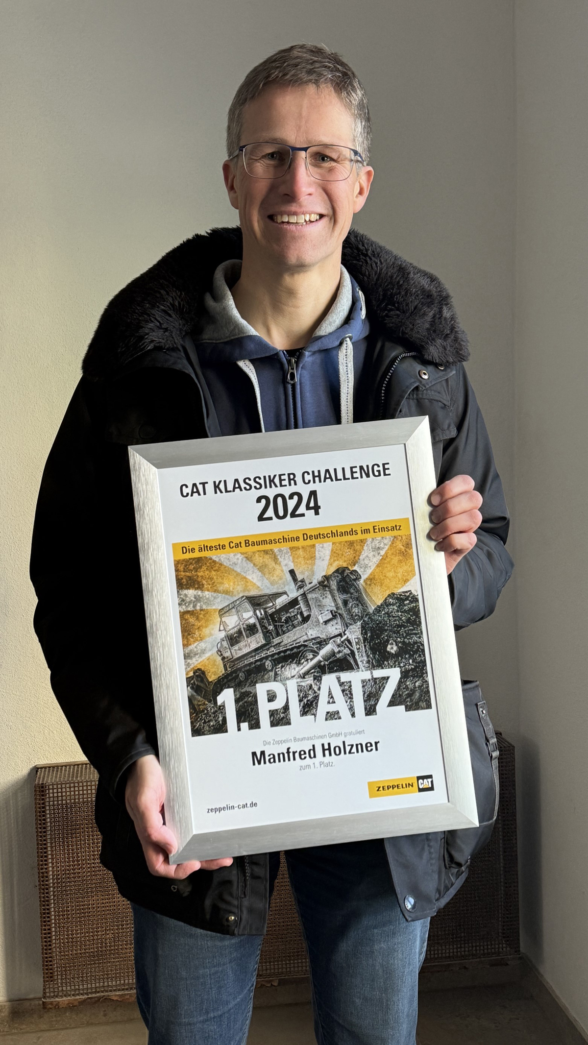 Wobei das mit heutigen Verhältnissen nicht unmittelbar vergleichbar ist. Hochklettern, in der Kabine Platz nehmen, Schlüssel umdrehen und schon geht es los – ganz so einfach ist es nicht. Bevor der Sechs-Zylinder-Dieselmotor mit 8,6 l Hubraum die Arbeit aufnimmt, muss zunächst der Benzin-Startermotor angeworfen werden. Doch auch das bedarf der Vorbereitung, denn zunächst müssen über mehrere Stunden, circa einen halben Tag, die Öle aufgefüllt, die Komponenten durchgeschaut und alles einmal im Probebetrieb getestet werden. Dann kann es aber wirklich losgehen, den Oldtimer live und in Farbe per Videobeweis unter Reels des Instagram-Accounts von Zeppelin Baumaschinen zu verfolgen. Von der Funktionstüchtigkeit konnten sich auch die Zeppelin Juroren überzeugen, die bei einem Vor-Ort-Termin den Grader in Aktion erleben durften. Freuen darf sich der stolze Besitzer des robusten Klassikers über einen Flug mit dem Zeppelin Luftschiff über den Bodensee. Feierlich übergeben werden die beiden Tickets an Christian Holzner inmitten der neuesten Cat Baumaschinentechnologie im April auf der diesjährigen bauma.