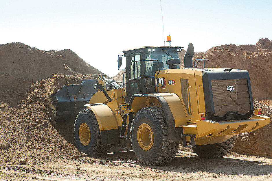 Mit dem Zusatz GC, was für General Construction steht, zeigt sich laut Zeppelin wiederum ein 22 t schwerer Radlader, der auf bewährter Technik fußt, sich gleichzeitig aber durch seine praxisgerechte Ausrüstung auszeichnet. Neben verbautem Automatiklüfter, Load-Sensing-Hydraulik und einer intuitiven Bedienung soll die Maschine mit niedrigem Kraftstoffverbrauch und geringeren Betriebskosten aufwarten. Verbaut ist ein Stufe V konformer Cat-C9.3B-Motor mit 23 kW Leistung. Der neue Lader verfügt laut Zeppelin über ein elektronisch geregeltes, automatisches Planeten-Lastschaltgetriebe mit vier Vor- sowie Rückwärtsgängen, Kickdown-Schalter und Schaltschutz. Gemessen am Schaufelbolzen liegt die Auskipphöhe bei rund 4,2 m, wodurch er vielfältig einsetzbar ist. Aufgrund seiner bewährten Z-Kinematik des Hubgestänges mit gegossenem Querträger und Kipphebel bietet der 966 GC hohe Grab- und Ausbrechkräfte von ca. 164 kN. Insgesamt, so Zeppelin, sorge die Weiterentwicklung beider Modelle für eine klare Effizienzsteigerung bei einfacherer Bedienung. t