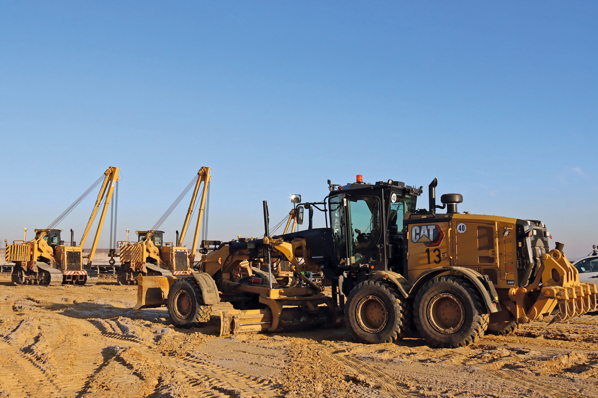 Vorab wird mithilfe von Cat Kettendozern das Grobplanum vorgeschoben und im Anschluss durch einen Motorgrader das eigentliche Feinplanum erstellt.