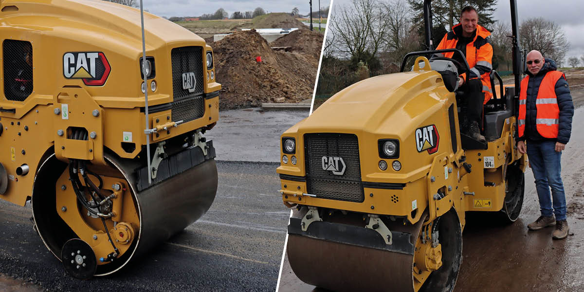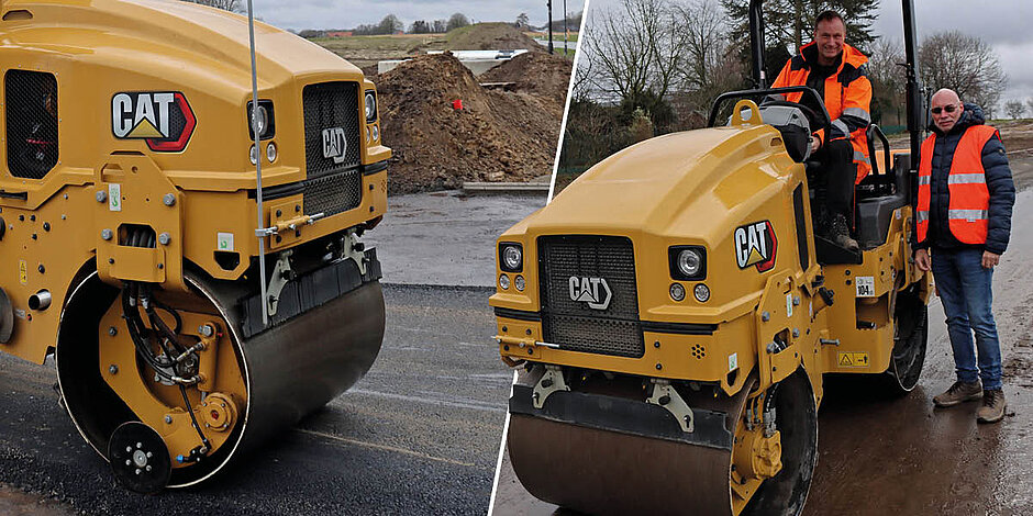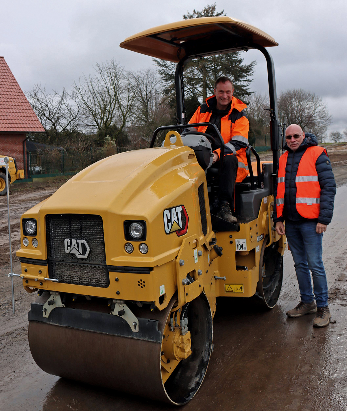 Zum Fuhrpark gehört unter anderem eine Tandemwalze vom Typ Cat 2.5 GC mit Pendelgelenk. Aufgrund ihrer ein Meter breiten Bandage ist die Walze kompakt und wendig, was sich etwa bei Übergängen bewährt. Mit 50 bzw. 62 Hz wirkt die Verdichtungsleistung der Glattmantelbandage auf den zu verdichtenden Asphalt ein. Die kompakte Walze verfügt über ein 400 kg schweres Ballastpaket. Somit erreicht sie vorne eine statische Linienlast von 11,85 kg/cm und hinten von 13,36 kg/cm, was der flächenmäßigen »statischen« Verdichtung durch die Bandage zugutekommt. Durch den verschiebbaren Komfortsitz kann der Fahrer die Verdichtungsleistung im Blick behalten, Übergänge kontrollieren und auf Anschlüsse wie Fugen- und Nahtausbildungen achten, um diese fest anzudrücken. Die Asphaltkanten werden mit der Andruckrolle verdichtet. Bei einer Randeinfassung kommt die Schneidscheibe zum Einsatz. Für Griffigkeit der Asphaltdeckschicht sorgt im Anschluss der Splitt, der per Streuer auf den heißen Asphalt eingewalzt wird. »In dieser Kombination können wir mit unserer Maschine mehrere Arbeitsabläufe ausführen und daher die Cat Walze flexibel einsetzen. Das schätzen wiederum auch unsere Mietkunden«, so Burkhard Stüve.j