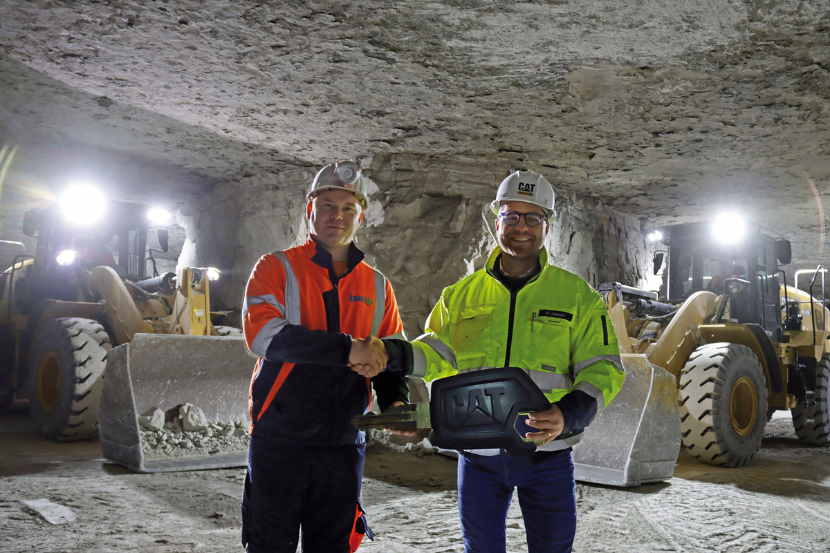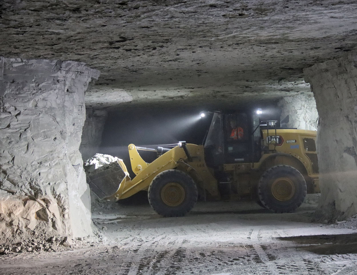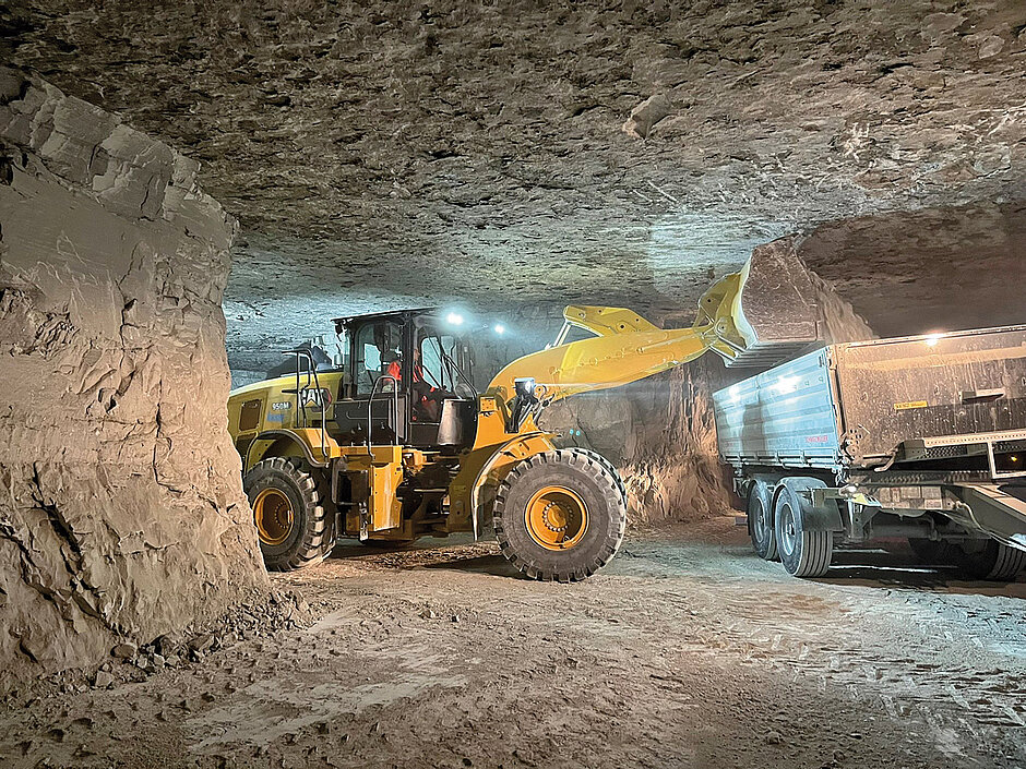 In einer Tiefe von bis zu 150 m kommt ein herkömmlicher Untertage-Fahrlader für den Abbau nicht infrage, so Henning Jansen, Zeppelin Verkaufsleiter im Bereich Konzernkunden: »Er wäre einfach zu lang, um sich zwischen den Kavernen zu bewegen. Anders ist es bei dem Radlader in der 20-Tonnen-Klasse, der einen Wenderadius von 5,9 m hat.« Zeppelin hatte dem Unternehmen Knauf die Lösung bereits seit mehreren Maschinengenerationen angeboten. Das Modell Cat 950M ist schon lange im Werk Hüttenheim im Einsatz. Aufgrund von Schichtbetrieb sitzen wechselnde Fahrer in der Maschine. »Damit alle Fahrer die identischen Arbeitsbedingungen haben, wurde wieder dasselbe Modell beziehungsweise dieselbe Generation gewählt«, lauteten die Argumente bei der Beschaffung. Denn in der Regel kann hier jeder jedes Gerät bedienen und so sollen die nahezu baugleichen Maschinen den Fahrern den Umgang damit erleichtern.